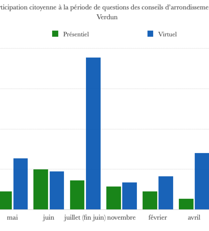 À Verdun, c’est toujours uniquement les questions écrites qui sont adressées aux élus lors de la période de questionnements. La conversation y est limitée puisqu’il n’y a pas la présence du citoyen. Il ne peut pas intervenir s’il est insatisfait de la réponse d’un élu.