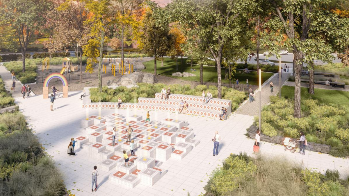 L’entrée du parc deviendra une place communautaire et de commémoration avec l’ajout de petits gradins. Le but est de dynamiser l’espace et que le lieu devienne propice aux rencontres et aux échanges.