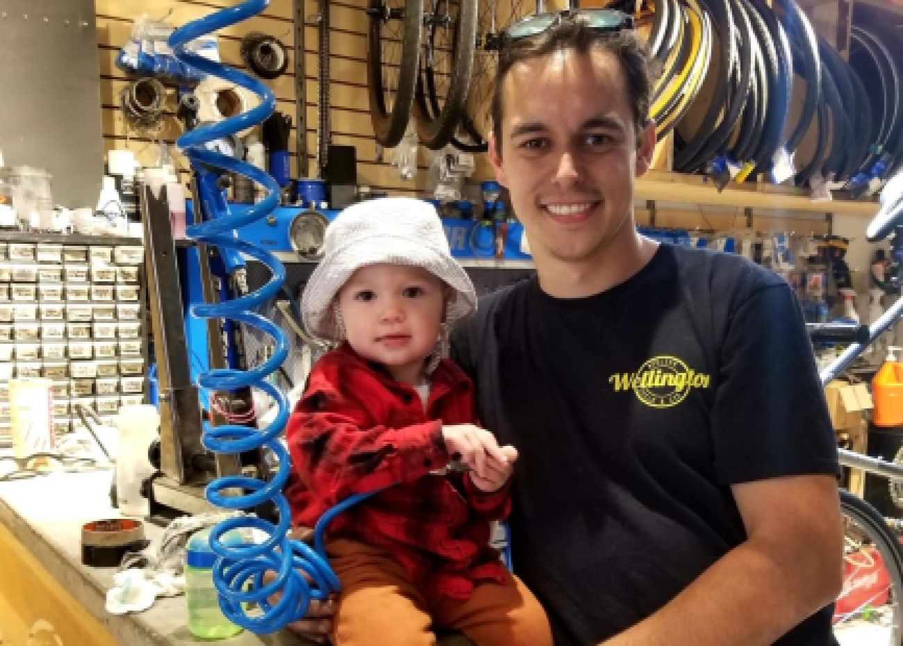 Hugo Pétrin, propriétaire de l’Atelier Wellington de vélos, juste en face de l’église Notre-Dame-des-Sept-Douleurs, n’est pas peu fier de laisser Jacob, son principal employé, s’amuser sur le comptoir de son joli commerce.