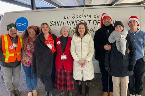 Pierre Parker, Céline-Audrey Beauregard, conseillère d’arrondissement, Joëlle Lemire, Hélène Villeneuve, responsable de la Saint-Vincent de Paul à L’Île-des-Sœurs, la mairesse Marie-Andrée Mauger, Martin Lefebvre, sa fille Sandrine et son fils Carl-Éloi.