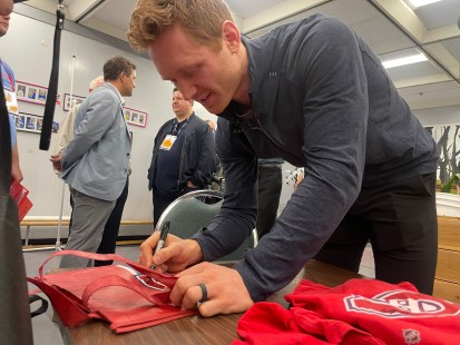 Le spécialiste des Habs Tony Marinaro était présent pour animer un échange avec les enfants. Les jeunes venaient poser leurs questions au micro, avant de prendre une photo avec leur vedette. Bien qu’ils soient partisans du CH, tous ne connaissent pas les joueurs de l’équipe sur le bout des doigts. «Est-ce que tu connais Cole Caufield?», demande une fillette. «Oui, c’est mon coéquipier!», lui répond avec le sourire Mike Matheson.