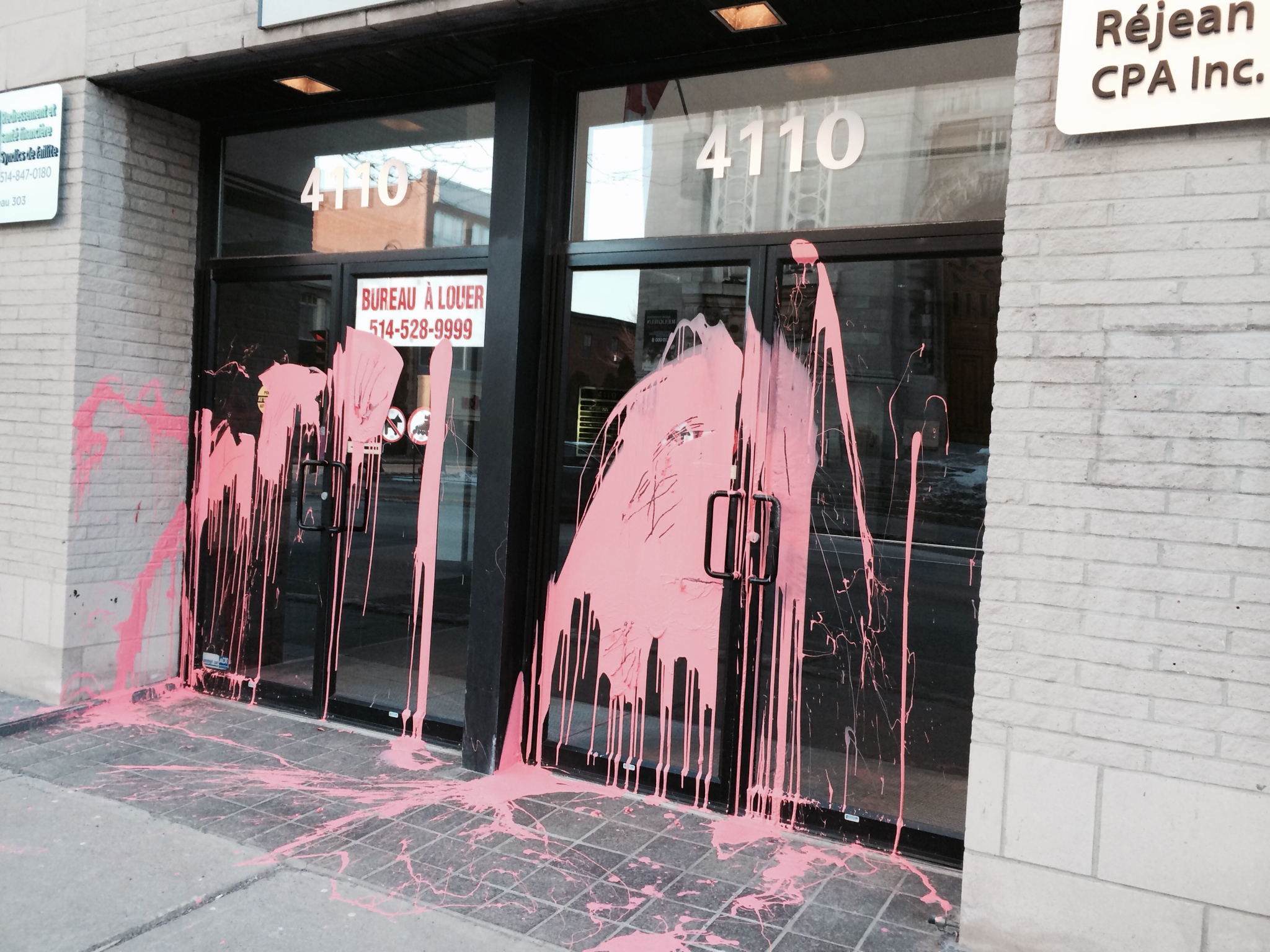 Le bureau du député libéral de l’arrondissement de Verdun, Jacques Daoust, a été vandalisé dans la nuit de dimanche à lundi. De la peinture rose a été lancée sur les portes du 4110, rue Wellington. Les vandales ont pris soin de coller une lettre sur la porte contenant des mots tels « révolution 2015 » avant de lancer la peinture.