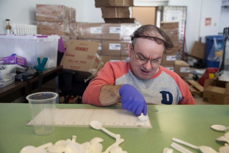 En entrant chez Amalgame, on met les pieds dans une véritable fourmilière. Une vingtaine de personnes en fauteuil roulant sont installées autour de deux grandes tables, couvertes de milliers de cuillères en plastique. L’objectif? Faire des piles de 48 ustensiles, que Rosemarie mettra ensuite dans des petites boites qui seront revendues en épicerie.