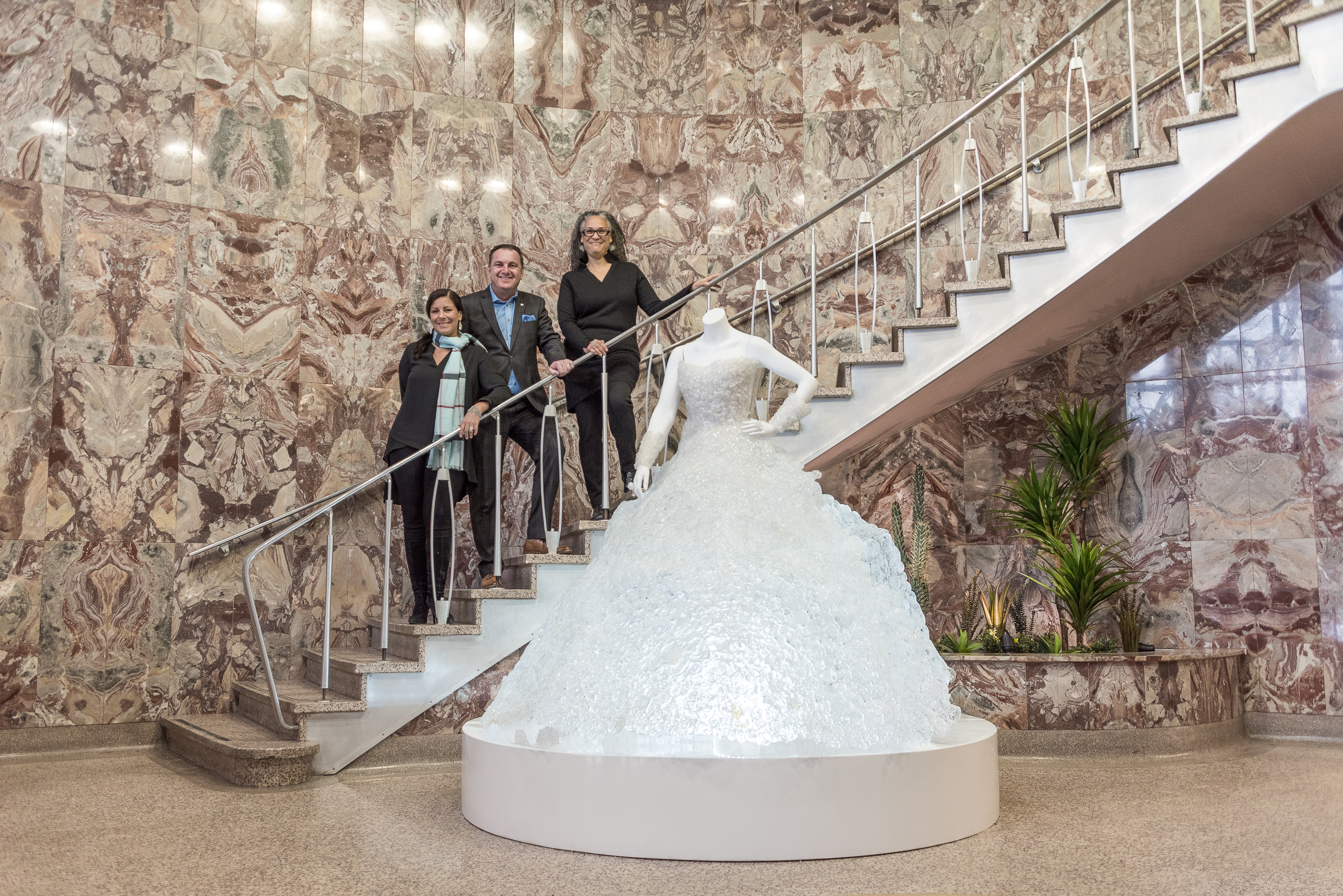 Après avoir passée cinq ans à la biosphère dans le cadre du projet O.N.E – Objets non enfouis, l’œuvre Ordonnance royale est exposée depuis le 25 janvier à la Mairie de Verdun. Cette robe de 200 livres est faite de 6 800 pots de pilules recyclés, qui prennent la forme d’un mannequin, de manches, d’une couronne et d’une crinoline.