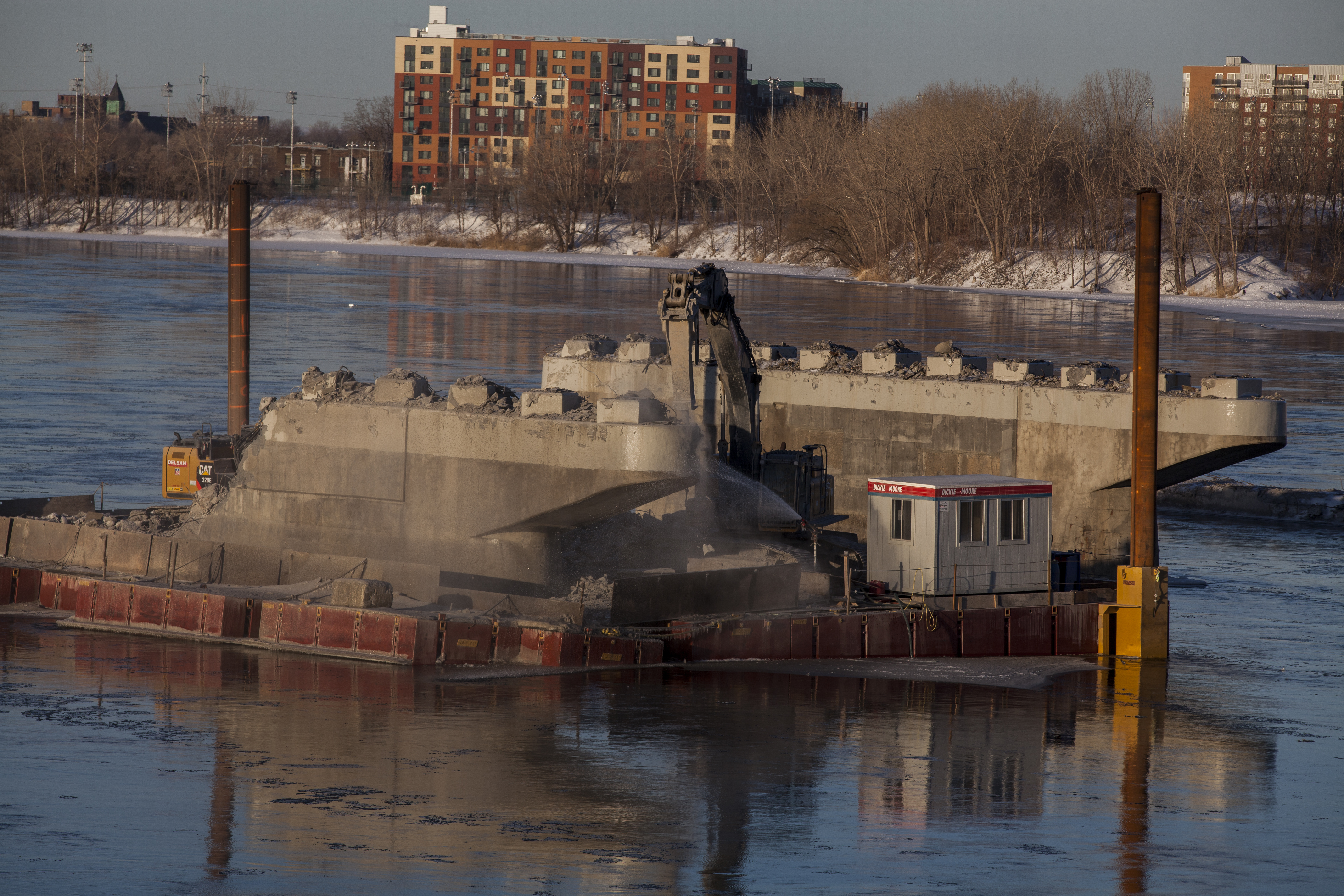 «Une fois le pilier bien ceinturé, la pelle mécanique vient le détruire sous l’eau. Les débris sont ainsi confinés à un espace restreint, préservant ainsi la qualité de l’eau du chenal», explique Annie-Claire Fournier, relationniste pour SSL.