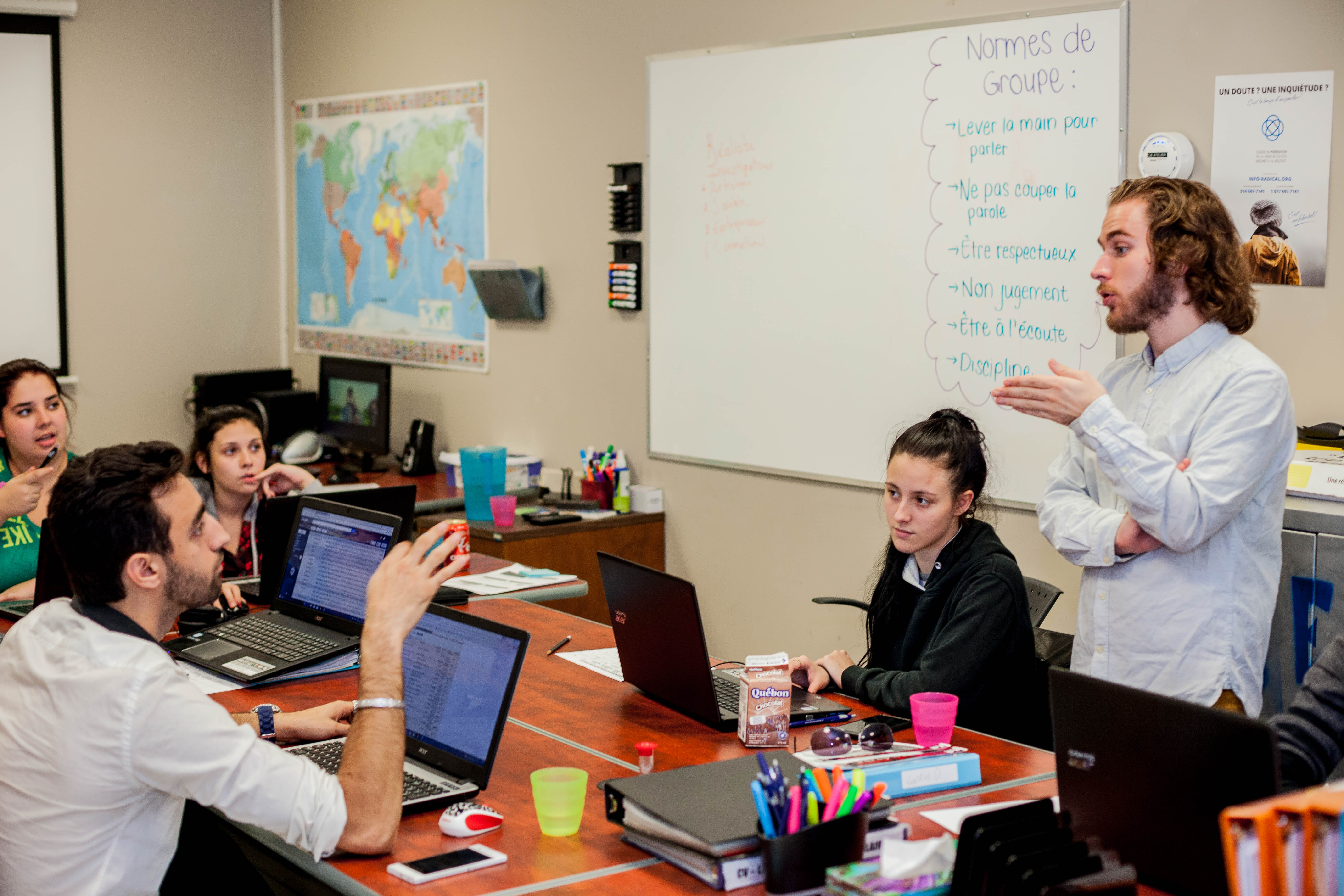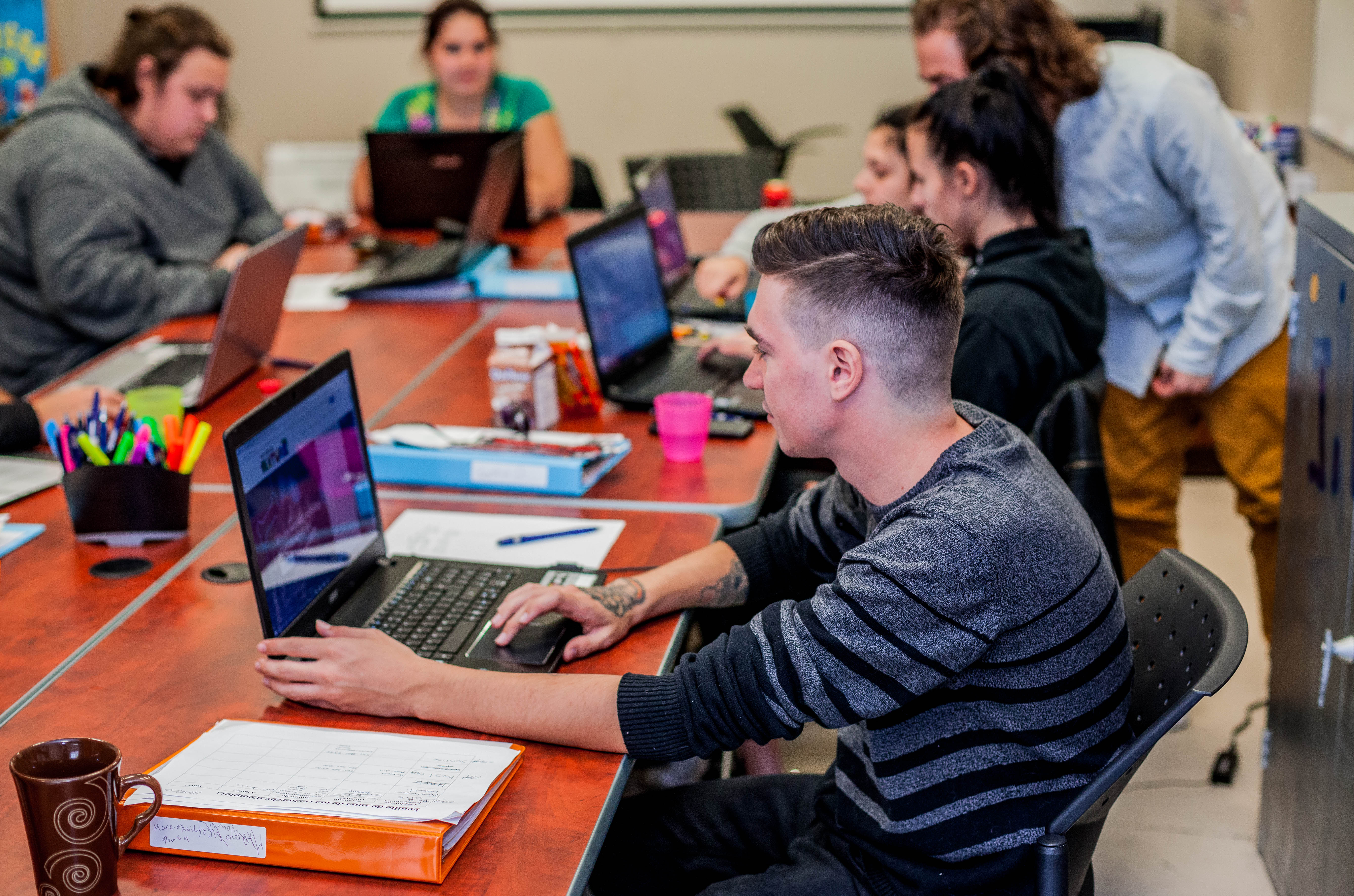 Dans le local de la rue Notre-Dame, près d’une dizaine de jeunes ont le nez dans les livres et les yeux rivés sur les ordinateurs. Avec des intervenants, les chercheurs d’emploi, dont la plupart n’ont pas complété leur secondaire, apprennent les stratégies de recherche d’emploi durant cette formation de quatre jours par semaine, pendant huit semaines.
