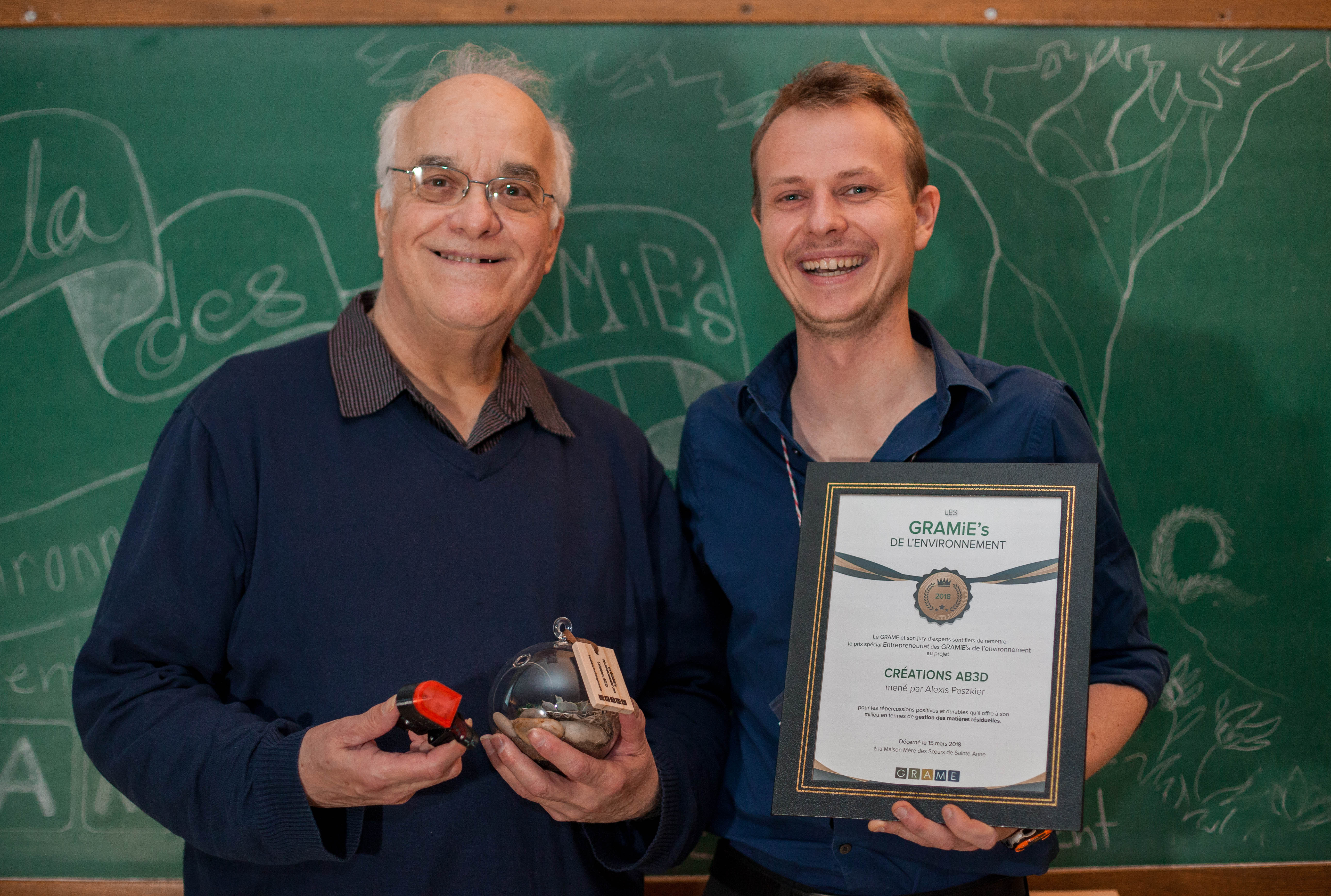 Créations AB3D propose un nouveau concept, des lumières de vélo imprimées en trois dimensions avec du plastique recyclé et qui fonctionnent sans batterie. La lumière de vélo s’allume à l’aide d’aimants et du mouvement de la roue. Cinq bouteilles en plastique permettent de créer une lumière, qui dure toute la vie.
