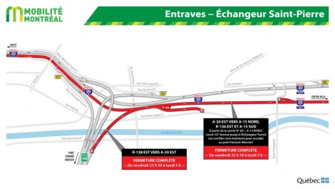 L’autoroute 20 en direction du centre-ville sera complètement fermée ce weekend à partir de l’autoroute 13, dans l’arrondissement de Lachine, jusqu’à l’échangeur Turcot. La bretelle du pont Mercier vers le centre-ville sera également inutilisable.