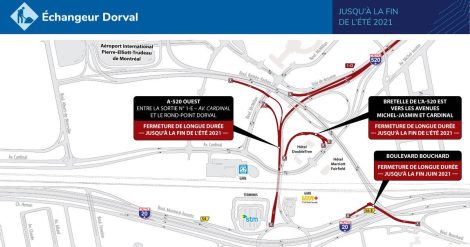 La fermeture de l’autoroute 520 en direction de l’ouest est maintenue jusqu’à la fin de l’été 2021. Cette entrave est nécessaire afin de procéder à des travaux de finition dans le cadre du projet de réaménagement de l’échangeur Dorval.