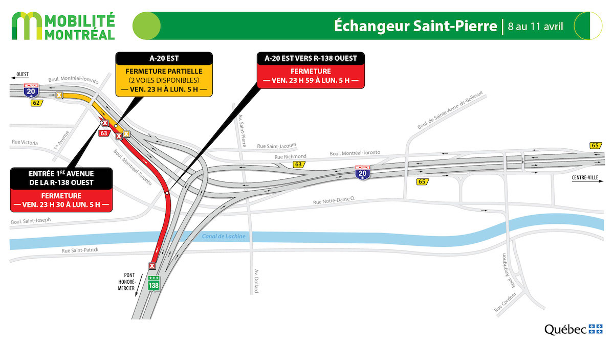 D’abord, la bretelle menant de l’A-20 en direction est (sortie 63) à la R-138 en direction ouest/pont Honoré-Mercier sera entièrement fermée à compter de 23h30 vendredi soir, et ce jusqu’à lundi matin, 5h. Le détour proposé sera de continuer jusqu’à la sortie 65 pour la rue Saint-Jacques et le boulevard Angrignon, puis de faire demi-tour via le boulevard de Sainte-Anne-de-Bellevue.