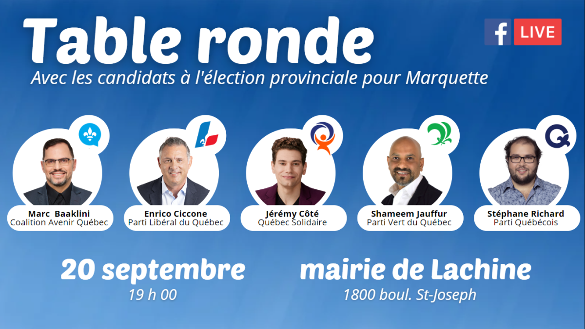 La mairesse de Lachine et le maire de Dorval animeront une table ronde avec les candidats à l’élection provinciale dans la circonscription de Marquette pour discuter de leurs engagements. L’événement sera ouvert au public et aura lieu le 20 septembre à la mairie de Lachine.