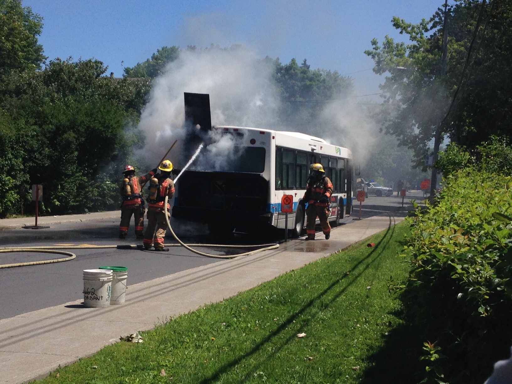 En avant-midi le jour de la Fête nationale, le véhicule s’est immobilisé au coin du boulevard Neptune et de l’avenue Parkfield parce que de la fumée s’échappait de l’arrière de l’autobus, où se trouve le moteur.
