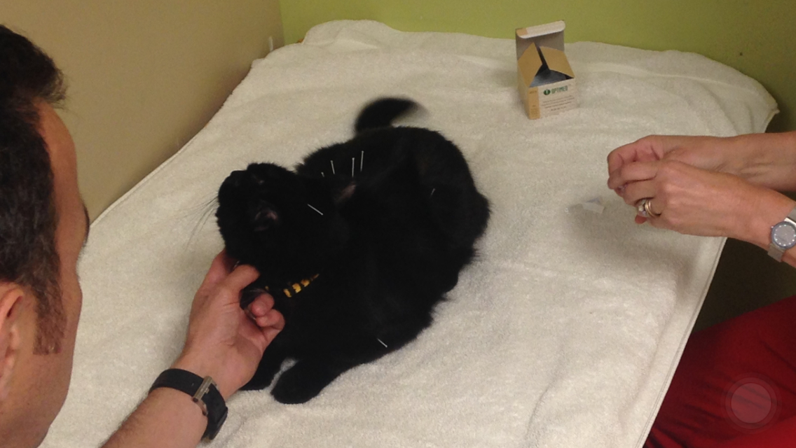 Une fois par mois, Marie et Rodolphe Coiscaud amènent leur chat de sept ans à une séance d’acupuncture. Les aiguilles sont placées une quinzaine de minutes sur le dos, le cou et une partie de la tête de Shiloh. Le traitement, jumelé à des mélanges d’herbes médicinales, a réussi à soulager les maux du félin.