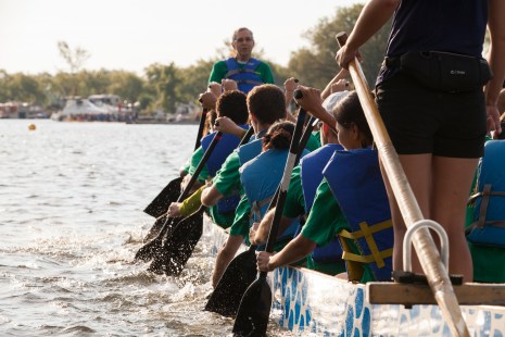 Durant toute la journée, trente bateaux-dragons se sont affrontés. Un bateau-dragon est un grand canot coloré à l’intérieur duquel vingt personnes peuvent pagayer. À l’avant de chaque bateau, il y a une tête de dragon. Chaque bateau compte un entraîneur à l’arrière et un batteur de tambour à l’avant.