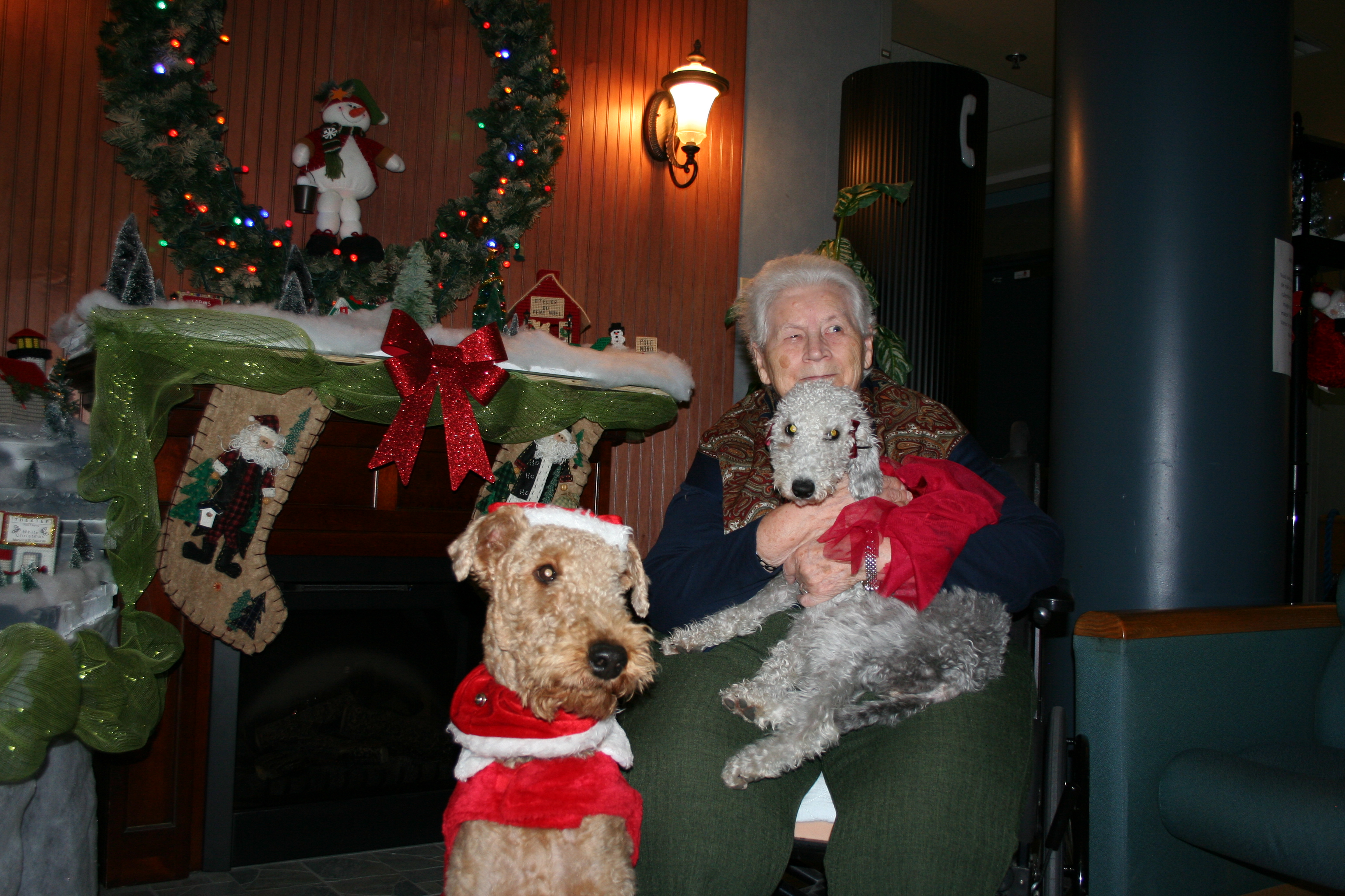 Pour ajouter à l’ambiance, Patricia Kadowaki, employée du CHSLD, costume ses chiens, Hunter et Florence, avec des habits de Noël. À ce duo «zoothérapeutique» s’est joint Pico, le shi-tzu d’une autre employée. Tous trois se baladent sur les étages, au grand plaisir des patients pour qui la résidence est devenue leur milieu de vie.