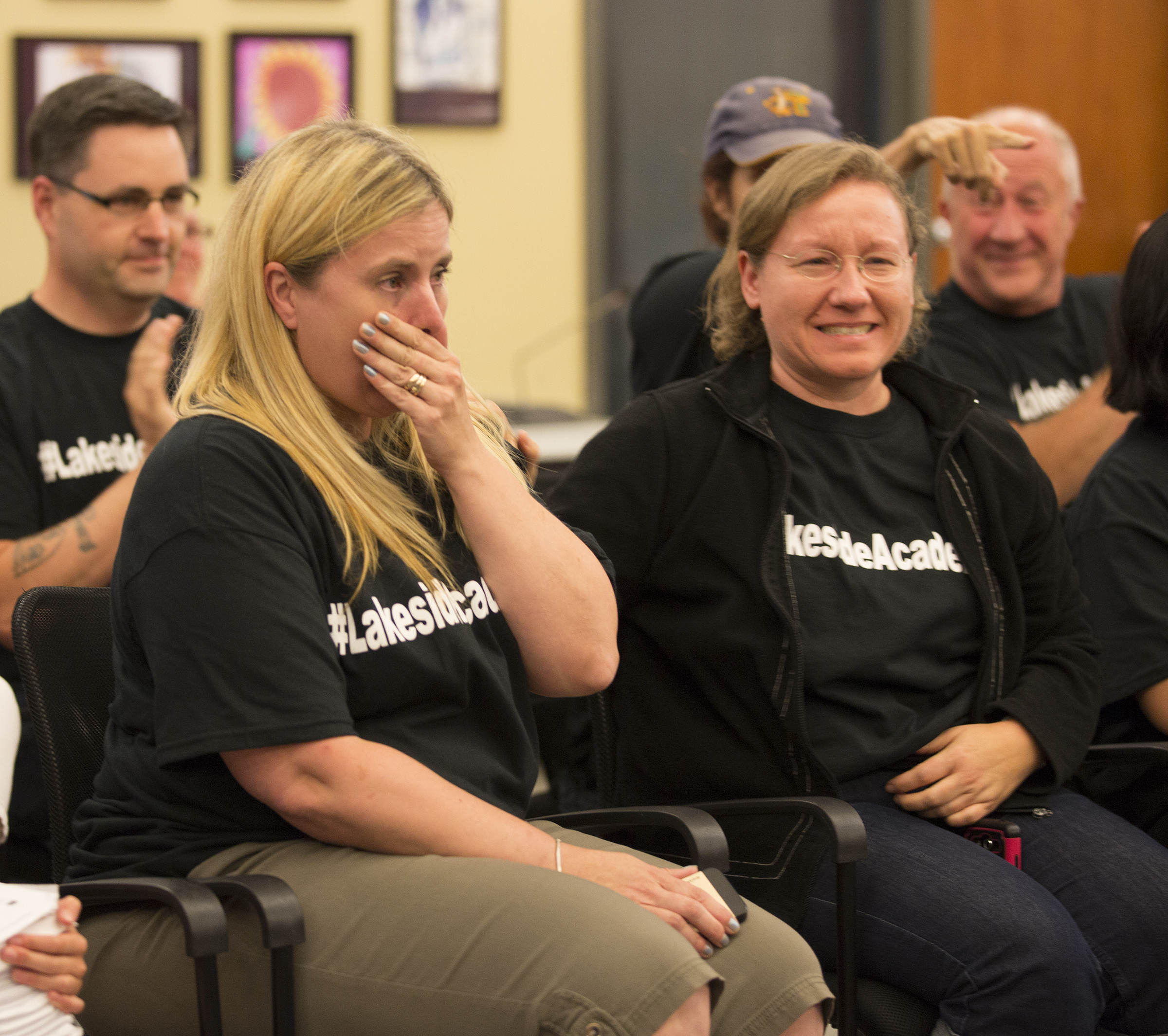 With tears streaming down her face, Jennifer Park, the mother who spearheaded the #SaveLakeside movement the last seven months, embraced LBPSB chair, Suanne Stein Day after the decision.