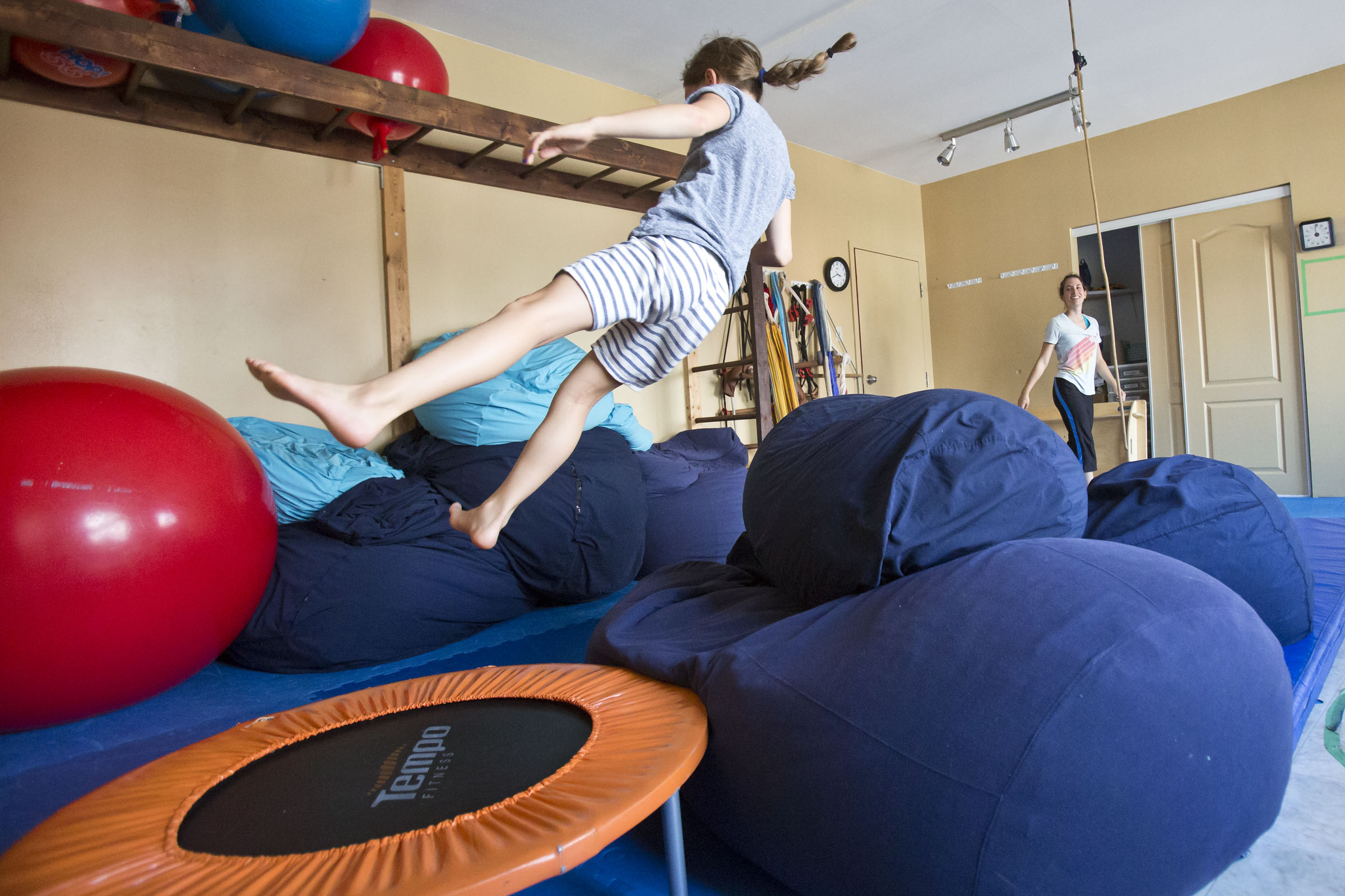 Les locaux sont remplis de balançoires, ballons, coussins et autres équipements utilisés pour répondre aux besoins de la jeune clientèle.