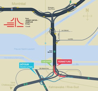 Il y aura fermeture complète de la bretelle d’accès en provenance de Montréal, en direction de La Prairie. Un détour via le réseau local sera mis en place.