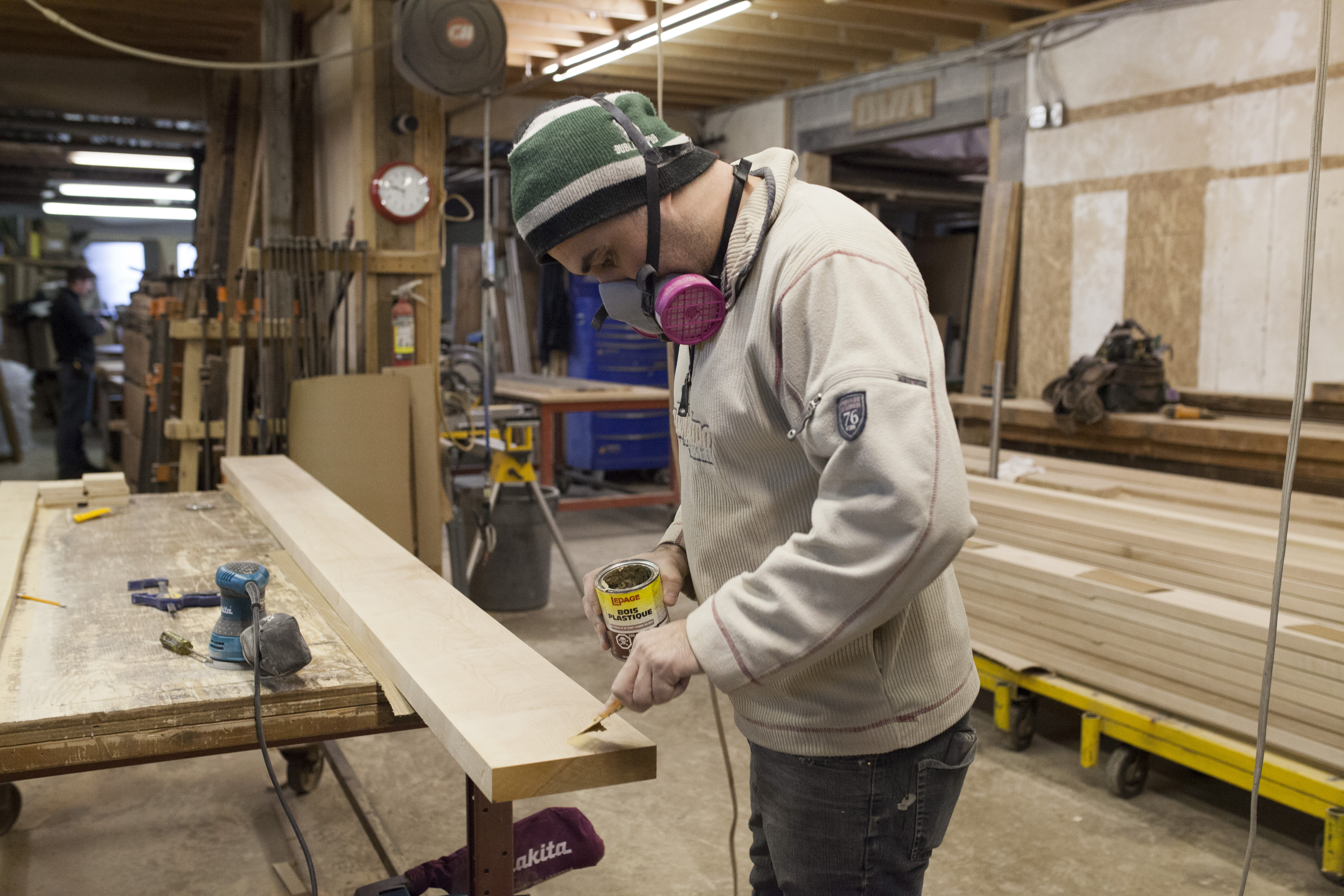 Au sous-sol, des employés, équipés de masques, sableuses et scies, s’affairent à concrétiser une commande de 40 tables, au son d’une musique tonitruante.