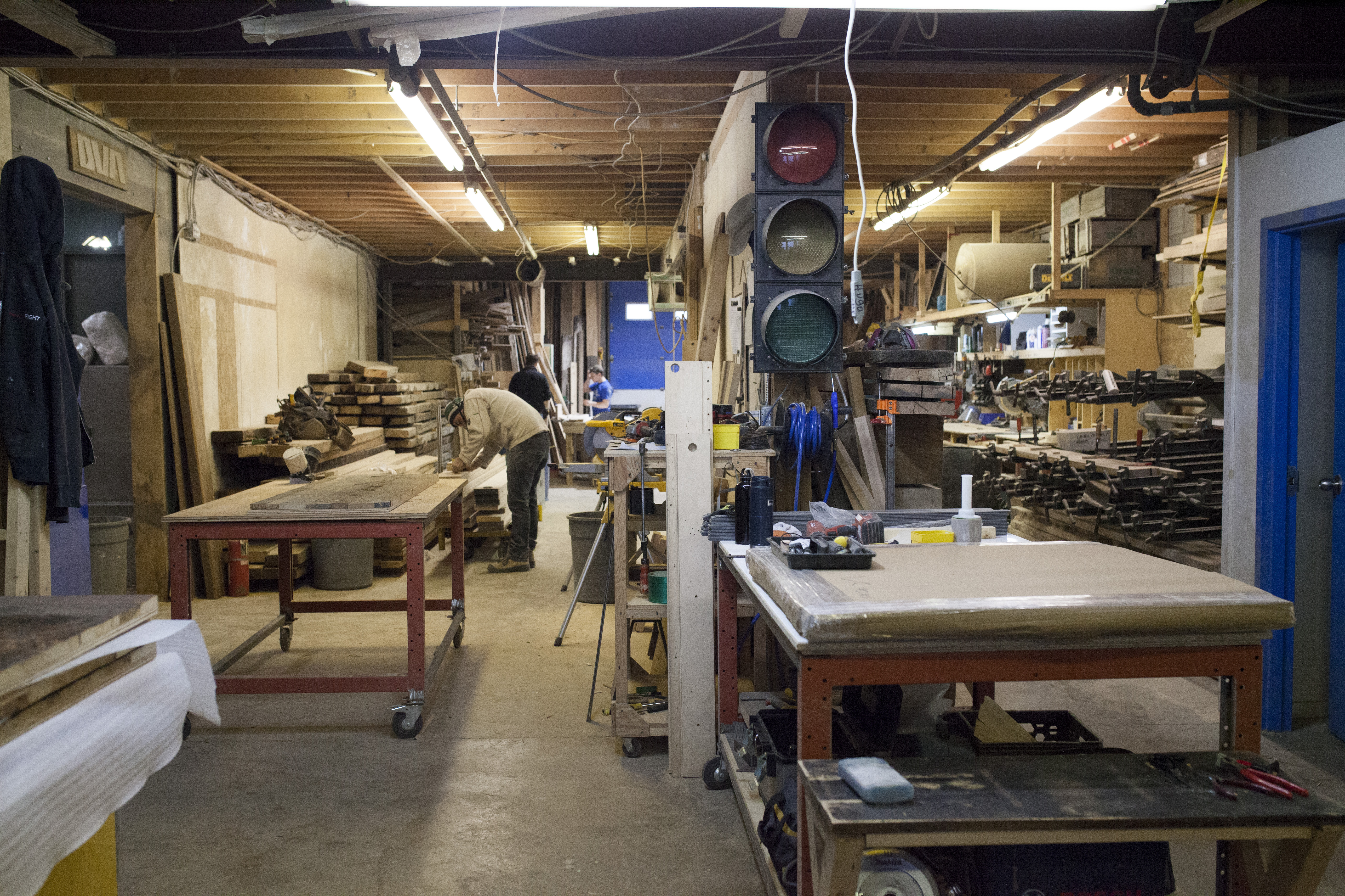 Au sous-sol, des employés, équipés de masques, sableuses et scies, s’affairent à concrétiser une commande de 40 tables, au son d’une musique tonitruante.