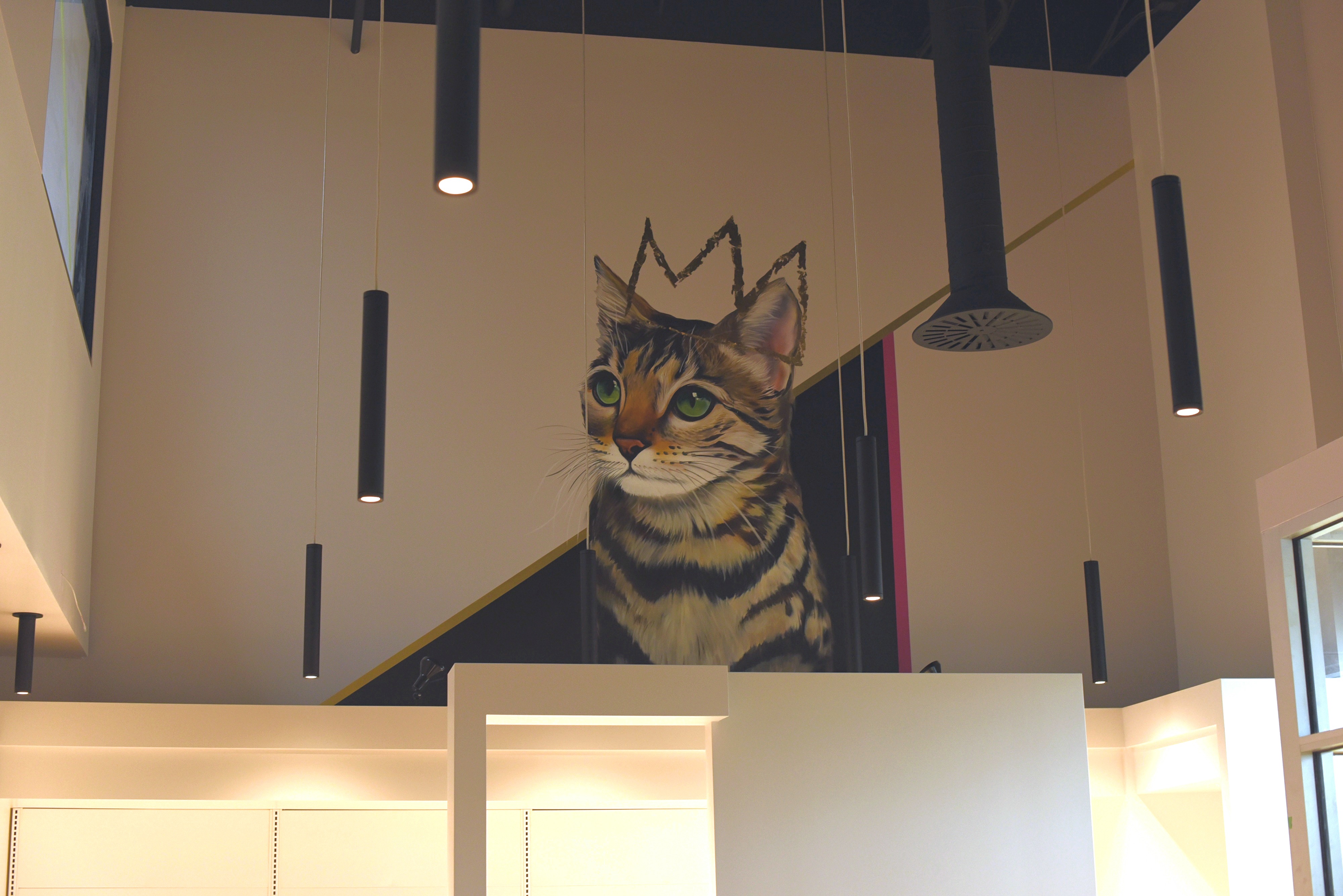 Un immense dessin de chat à droite et un autre de chien à gauche divisent la réception et indiquent aux maîtres où ils doivent aller patienter avec leur animal avant la consultation. Le félin et le canidé portent la célèbre couronne minimaliste dorée, symbole du peintre Jean-Michel Basquiat. «Ici les animaux sont rois et je voulais que ça se voit», explique la propriétaire.