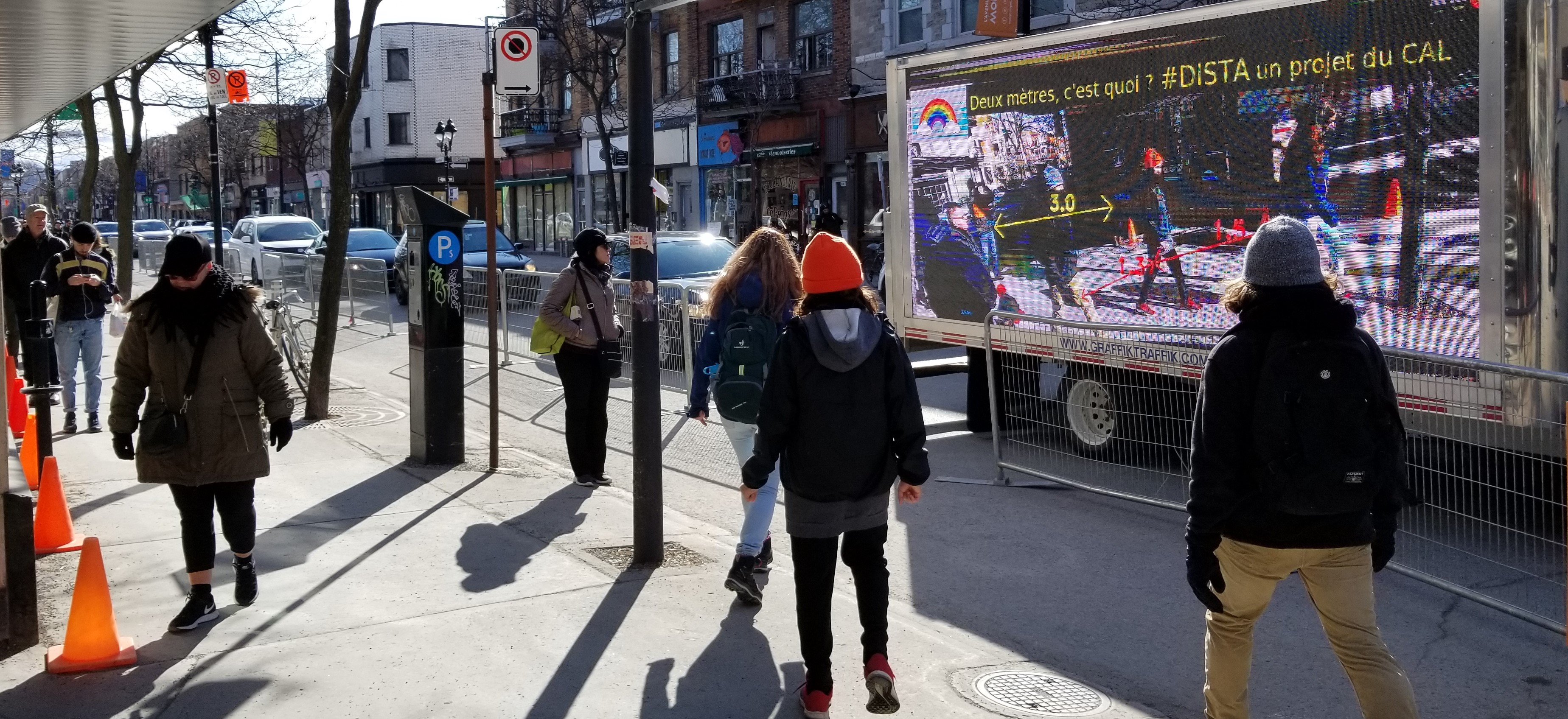 Deux enseignants du Cégep André-Laurendeau ont développé un outil qui permet aux gens de visualiser très clairement s’ils respectent une distance de deux mètres entre eux. Leur camion avec un grand écran visuel sillonne déjà les rues de Montréal et les créateurs espèrent pouvoir exporter rapidement leur technologie à grande échelle.
