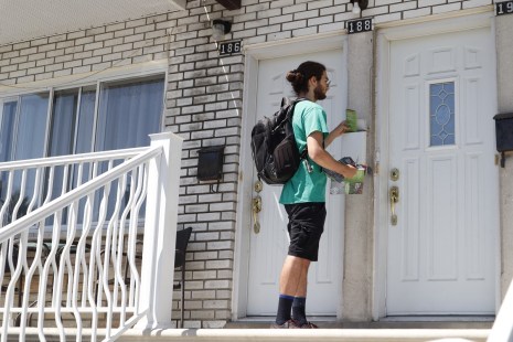 Théodore distribue des dépliants. Crédit: Oona Barrett, Métro Média.