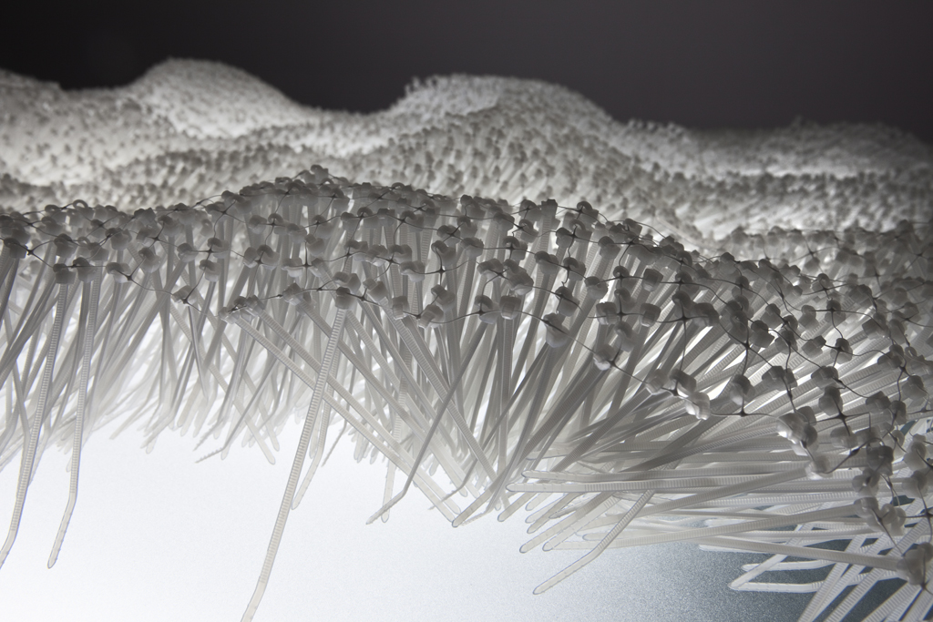 «Mon intérêt pour l’attache câble vient de son propre système. Lorsqu’il se referme sur lui-même, cet élément suggère le symbole de l’infini, l’Ouroboros (serpent ou dragon se mordant la queue). Je tente d’exploiter toutes les possibilités que permet ce matériau tel un jeu de mécano modulaire qui ne se termine jamais,» explique Élisabeth Picard.