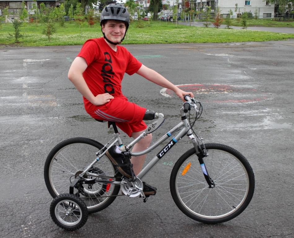 «Avant j’avais un vélo que je pouvais démarrer avec mes bras, mais je voulais changer pour un vrai, question d’être comme tout le monde», explique Charles-Antoine, qui doit rouler avec deux roues de taille moyenne attachées en arrière de sa bicyclette afin de conserver son équilibre pour le moment.