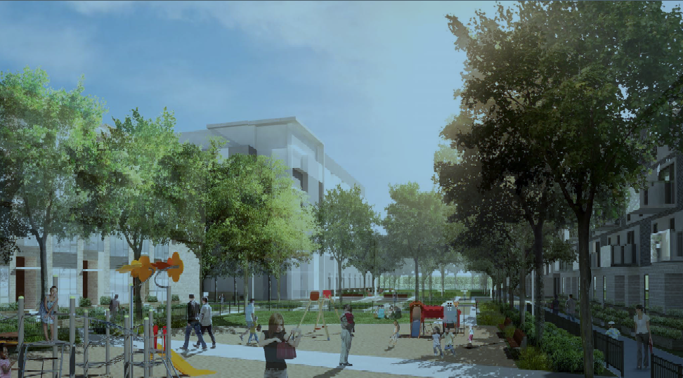 Les édifices proposés seraient répartis autour d’un parc central et auraient de trois à huit étages. Le projet prévoit 727 places de stationnement en sous-sol.