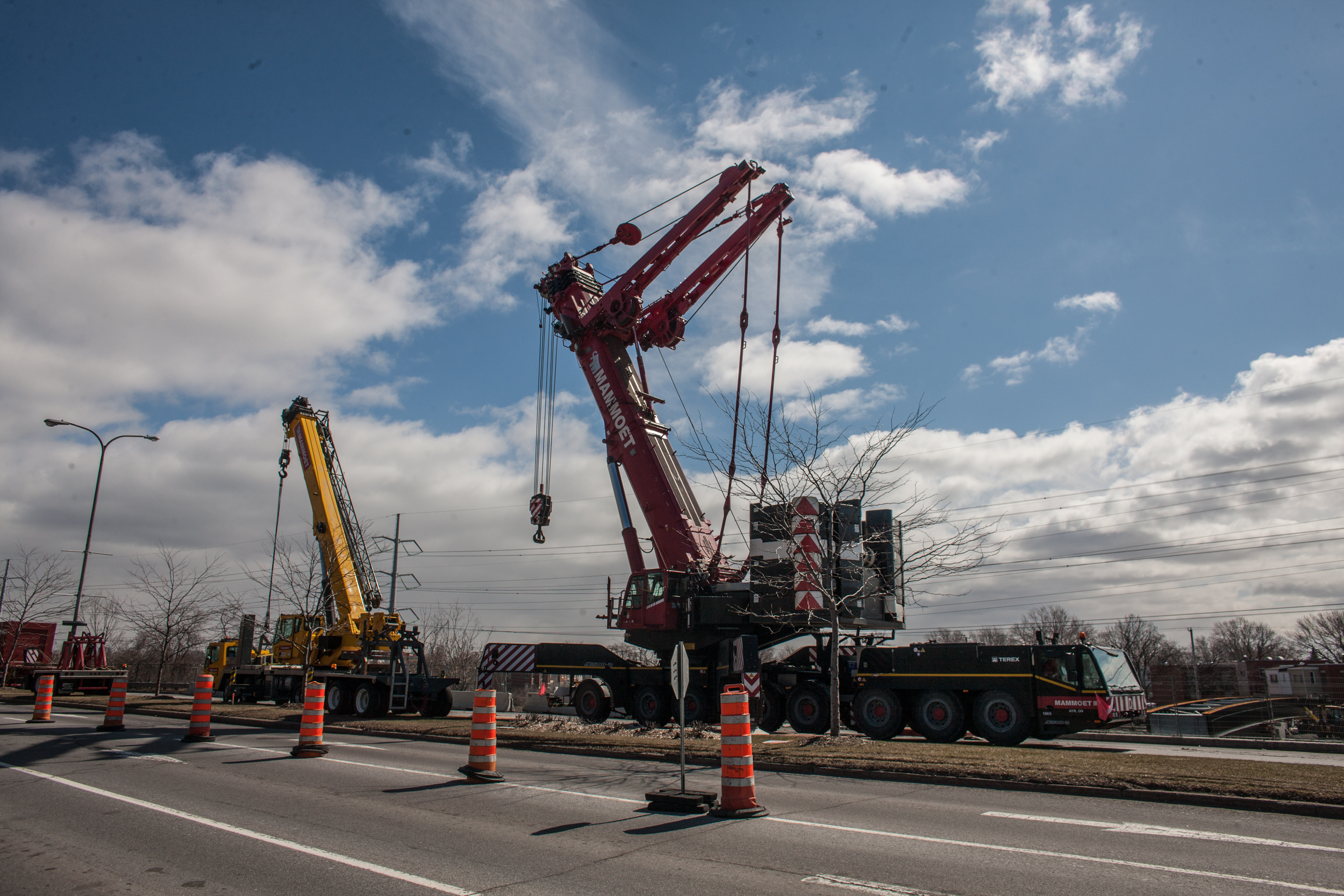 Deux grues géantes ont envahi ce weekend les trois voies du boulevard De La Vérendrye, pour la construction de la passerelle permettant de relier la piste cyclable de la rue Lapierre à celle longeant le boulevard Champlain.