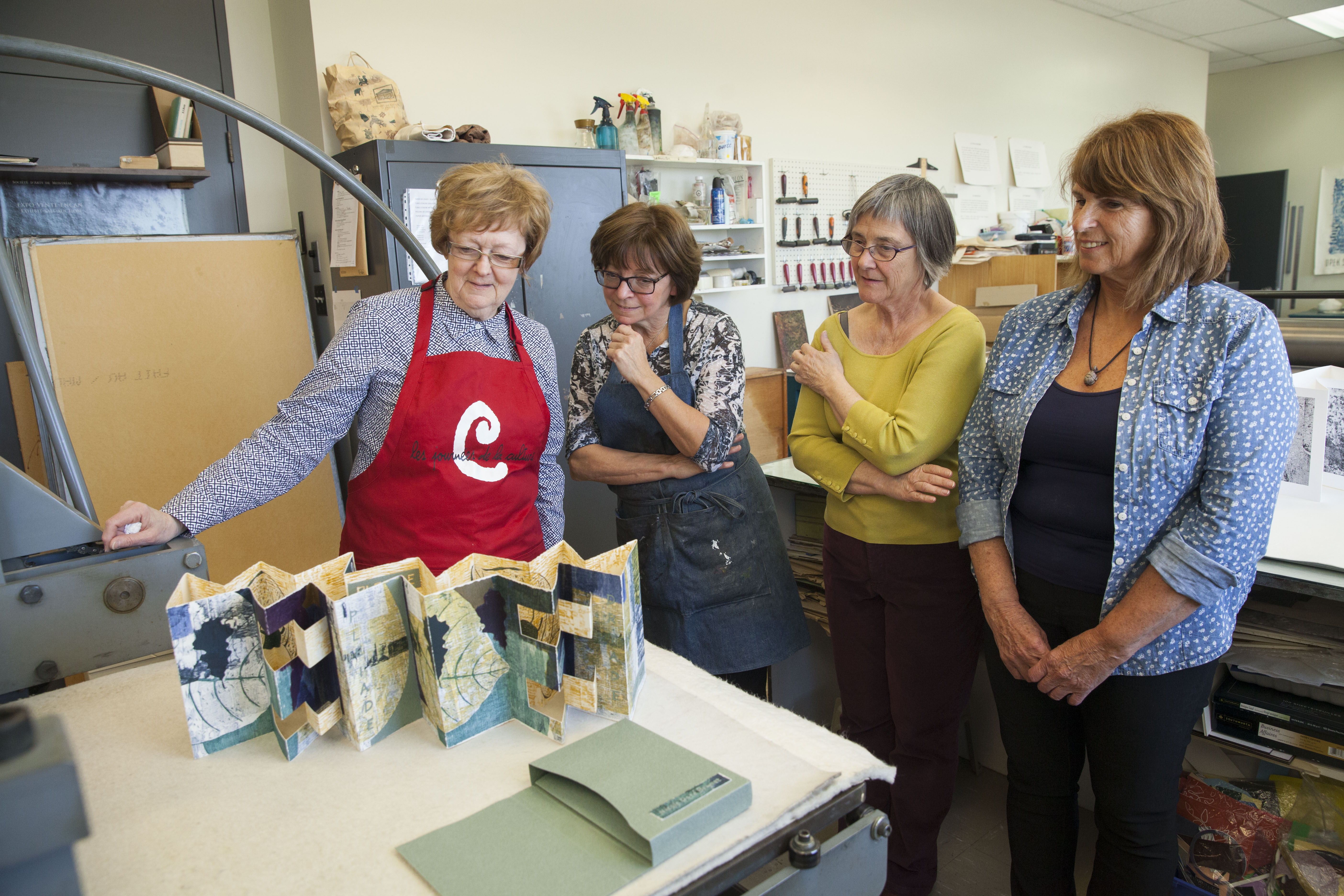 Pour appuyer ses dires, elle pointe les grandes fenêtres de l’atelier de gravure Glypto, situé au cinquième étage de la mairie de l’arrondissement. Par celles-ci, on voit le pont Honoré-Mercier enjambant le fleuve Saint-Laurent et les arbres au loin. Depuis 20 ans, le local est offert gracieusement à l’Association par la Ville.