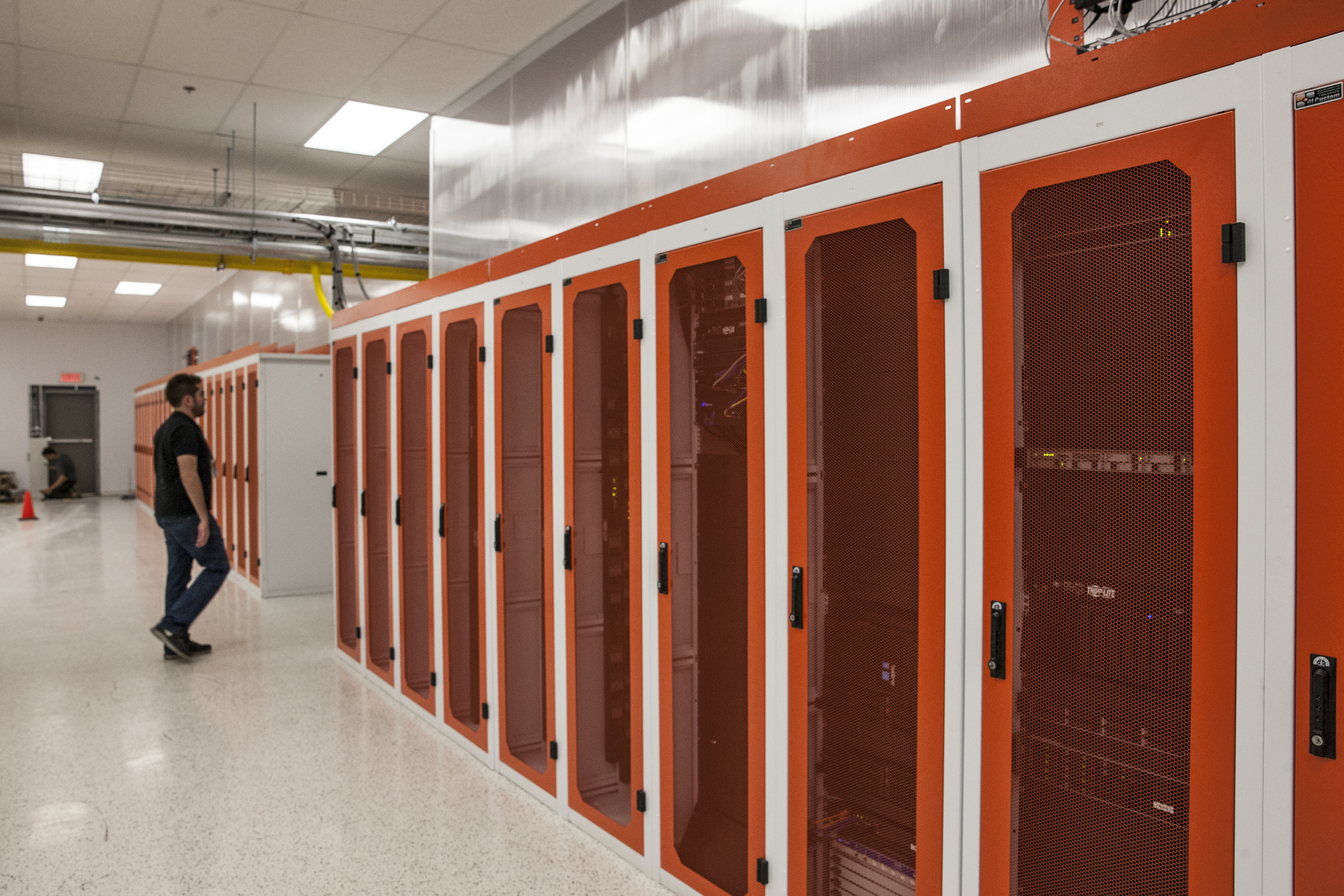 Un peu plus loin, deux rangées d’armoires à serveurs dotées de portes métalliques de couleur orange, et un département fermé et étanche avec une température de plus de 40 degrés Celsius.