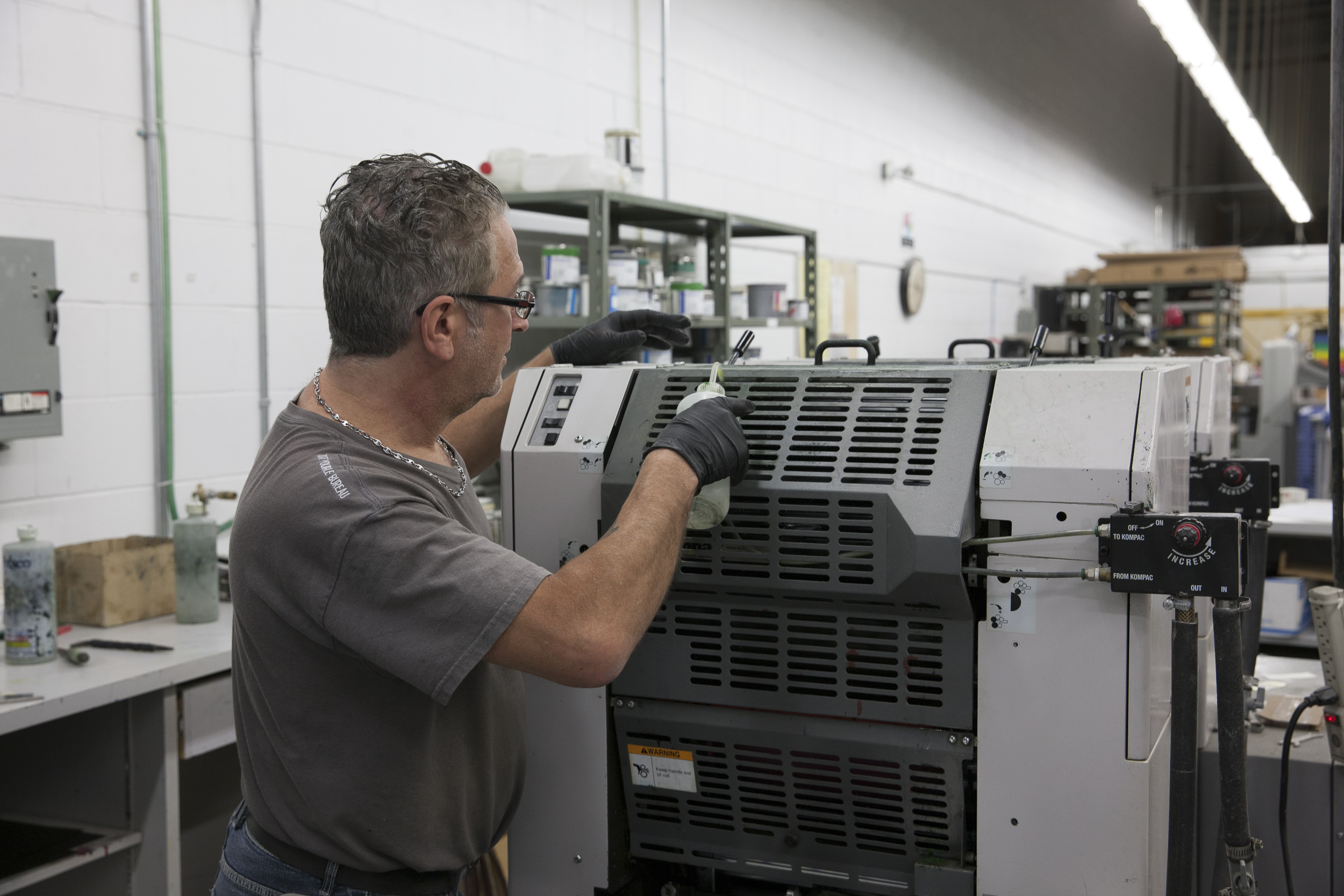 La visite de l’entreprise nous réserve quelques surprises: une salle de montre, un entrepôt de meubles usagés de bureau, un site de triage de matières recyclables et une imprimerie de papeterie commerciale pour dépliants, publicités, bannières et autres.