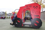 Un petit camion de pompier est monté sur des ressorts. Une simple pression provoque un effet de balancier, pour le plus grand bonheur des jeunes.