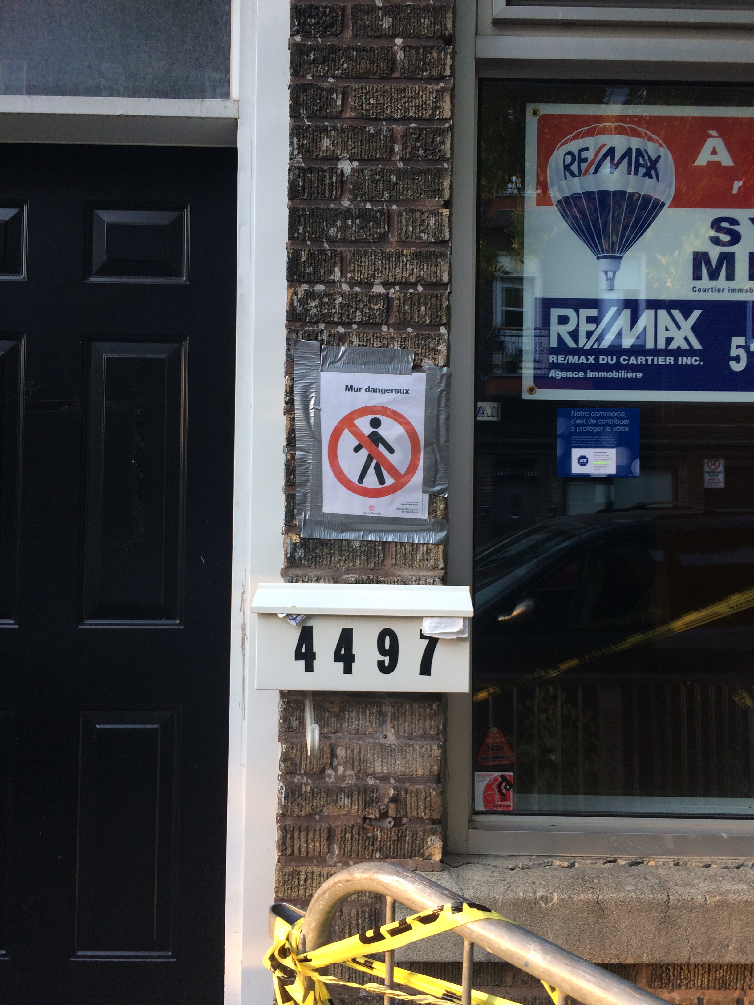 Des barrières avec une banderole danger sont apparus le 1er août sur le trottoir est de la rue Messier, à l’intersection de l’avenue Mont-Royal Est. Le Plateau-Mont-Royal a érigé le périmètre par mesure de sécurité en raison d’une façade présentant des risques d’affaissement.