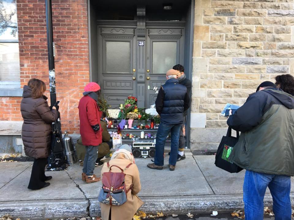 Plusieurs Montréalais se recueillaient toujours, certains les larmes aux yeux, autour de l’amas de fleurs et de mots laissés sur le palier de sa résidence.