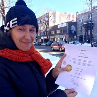 La Ville de Montréal a salué la contribution de l’artiste et Fée du Mile End, Patsy Van Roost, en la proclamant «Bâtisseuse de la Cité» pour ses projets créatifs qui révolutionnent la participation citoyenne et les relations de voisinage à travers la ville.