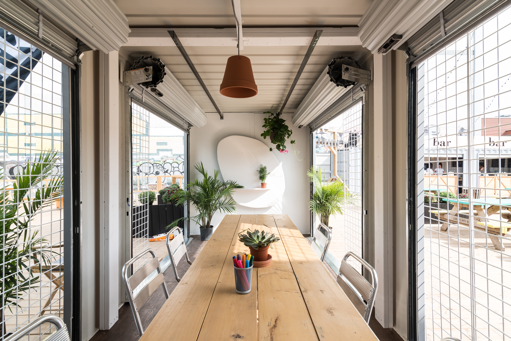 L’espace en plein air est composé de plusieurs conteneurs. Il offre la possibilité aux gens d’utiliser deux salles de réunion gratuitement, dont une fait le double de celle de l’année dernière. Une scène permanente de type pergola est également installée afin d’y présenter leurs quatre spectacles-surprises et des conférences, mais aussi pour y travailler.
