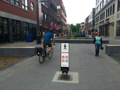 À la demande du Poste de quartier (PDQ) 38, des bollards ont été installés par l’arrondissement du Plateau-Mont-Royal aux deux entrées de la place. Des panneaux de signalisation en hauteur sont également visibles à toutes les intersections de la rue et sur la place pour avertir les cyclistes qu’il est interdit de rouler à vélo.