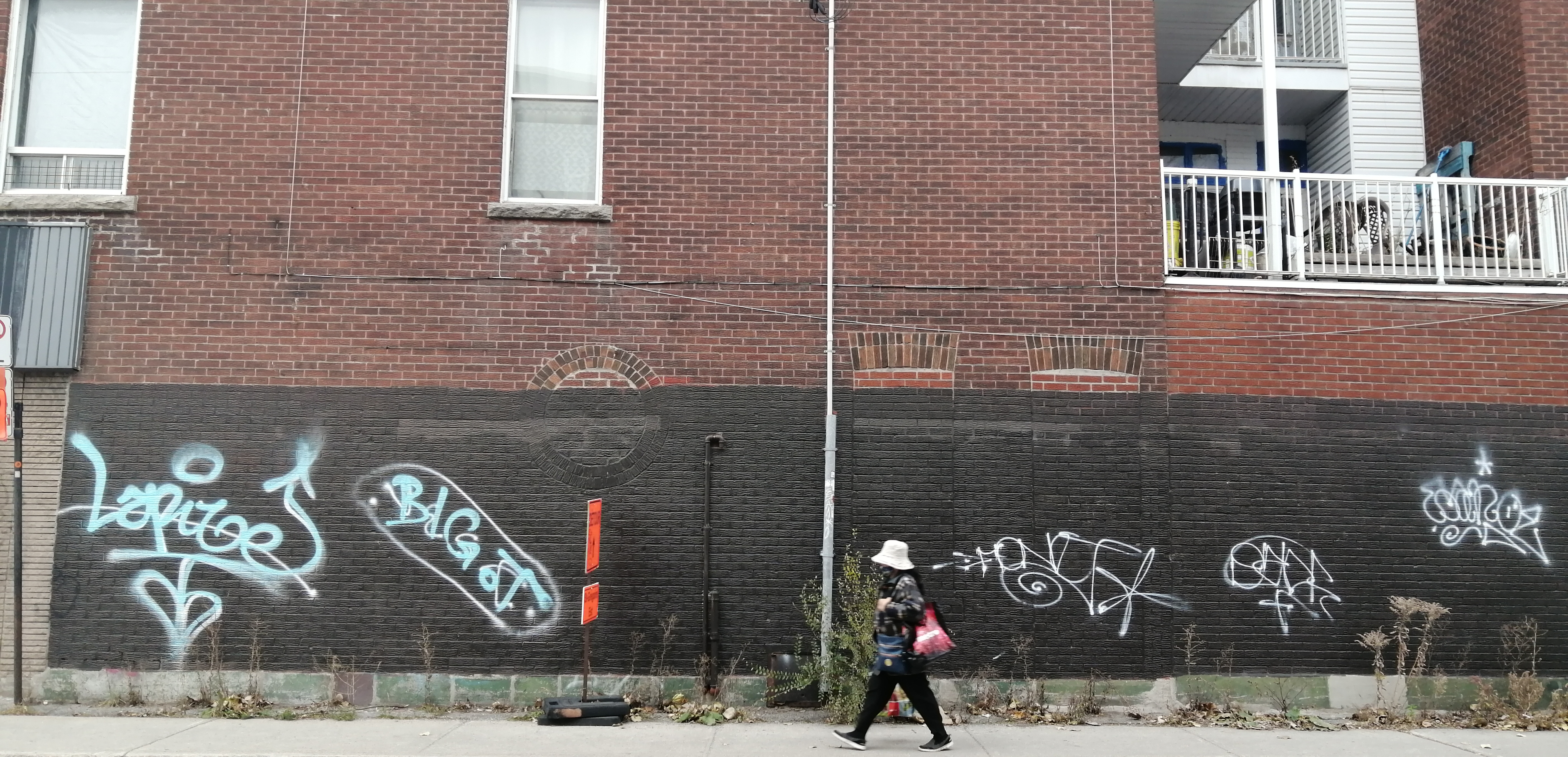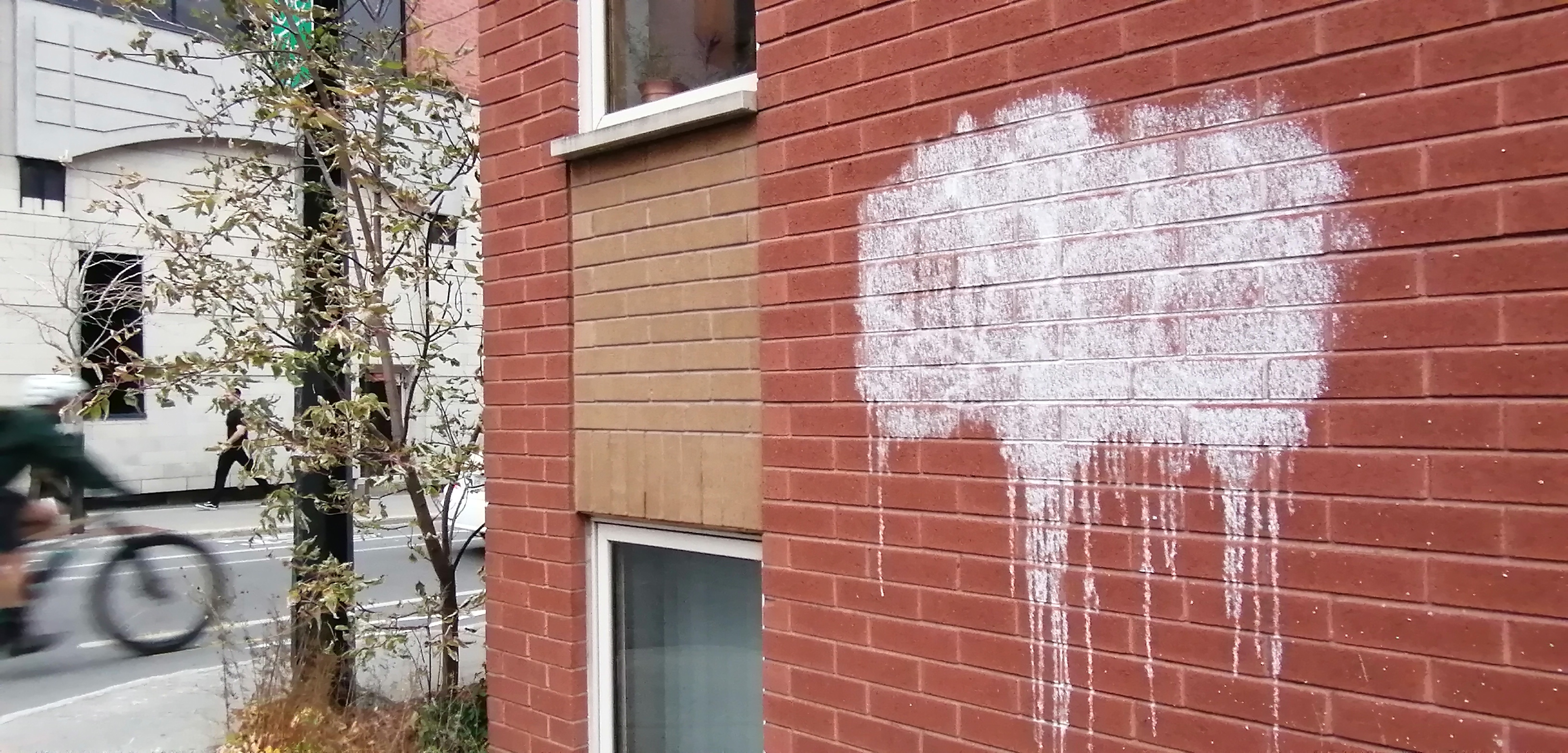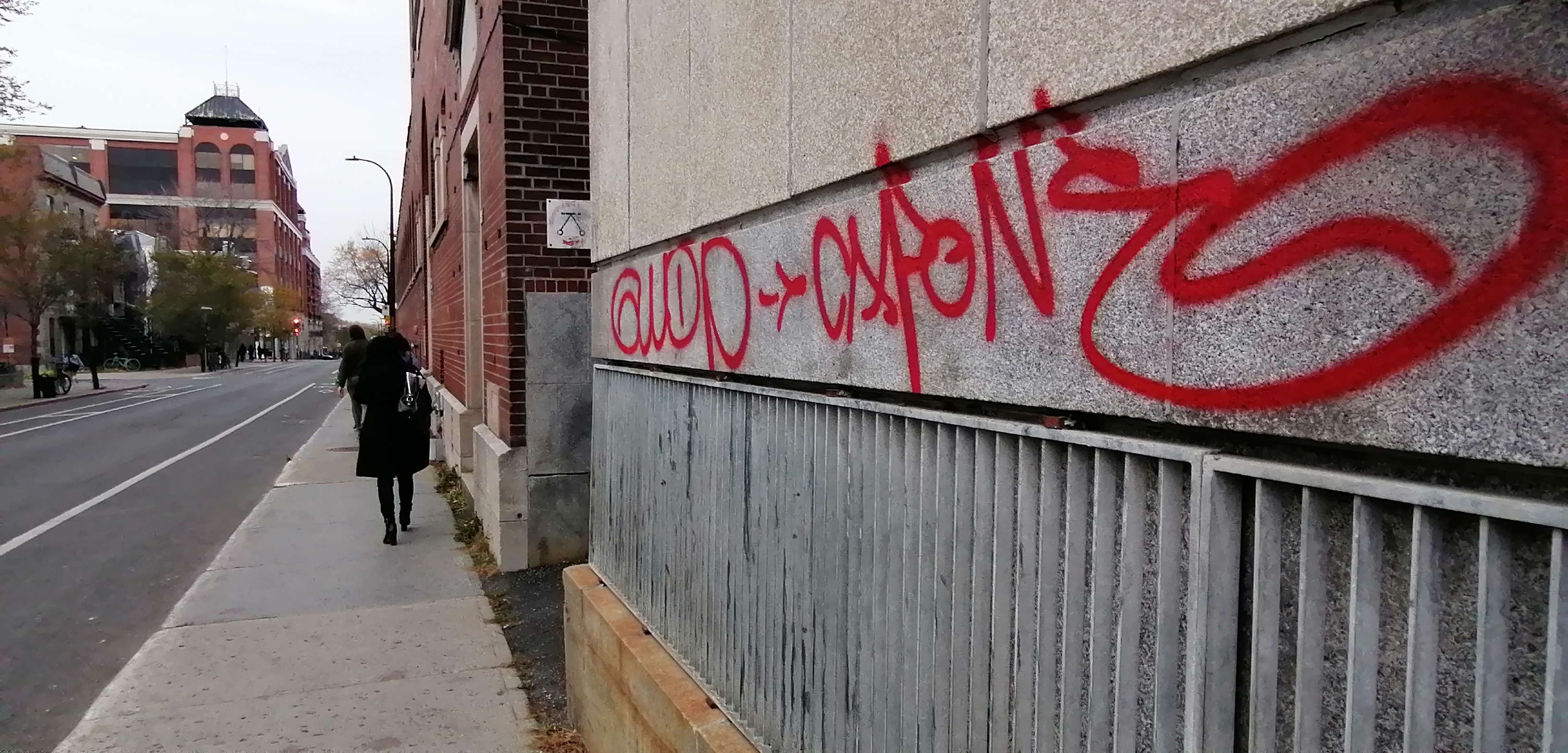 Aucune surface n’est épargnée : les logements, le sol, les panneaux de signalisation. Et même les institutions, comme l’École nationale de théâtre du Canada ou encore la bâtisse des Sœurs franciscaines missionnaires de Marie.