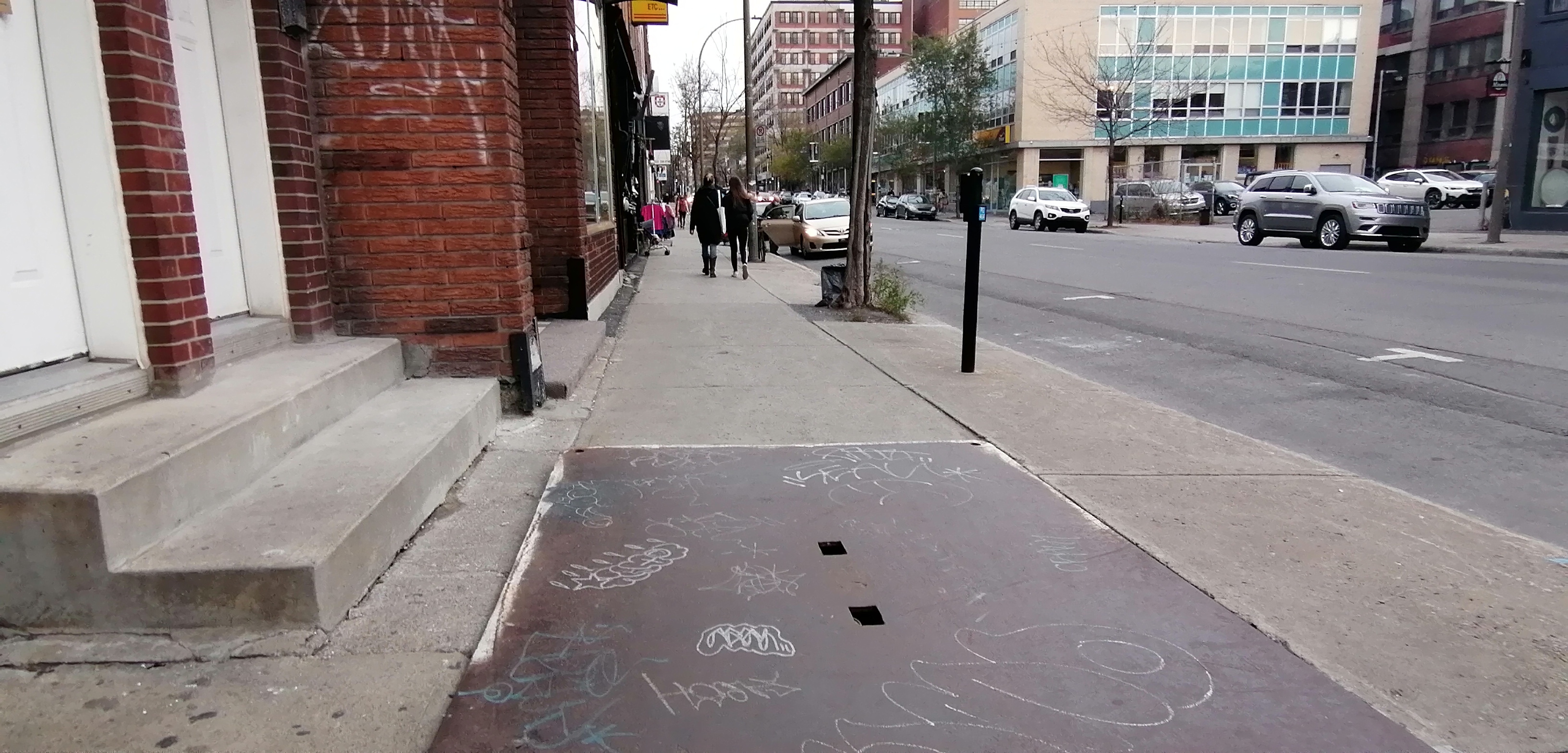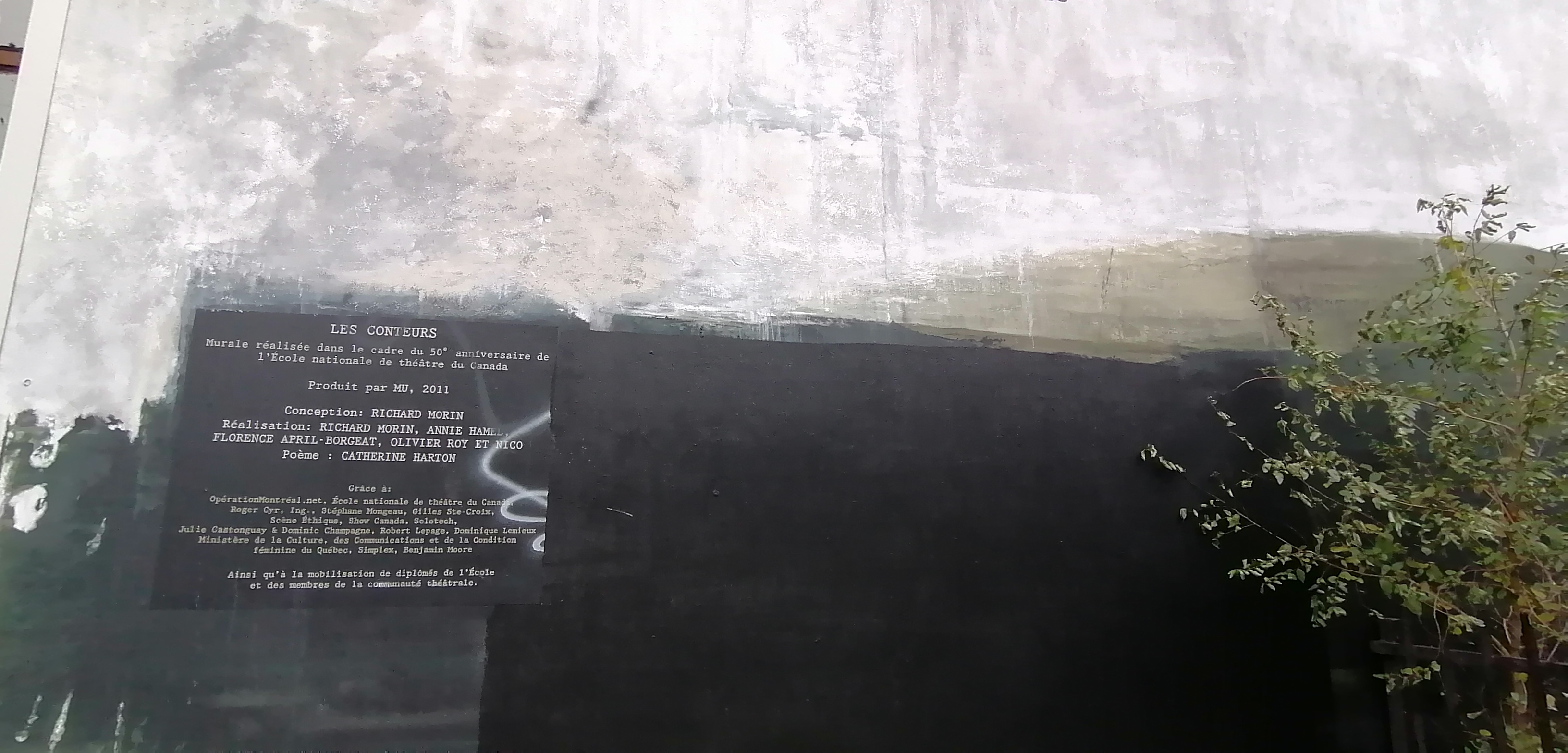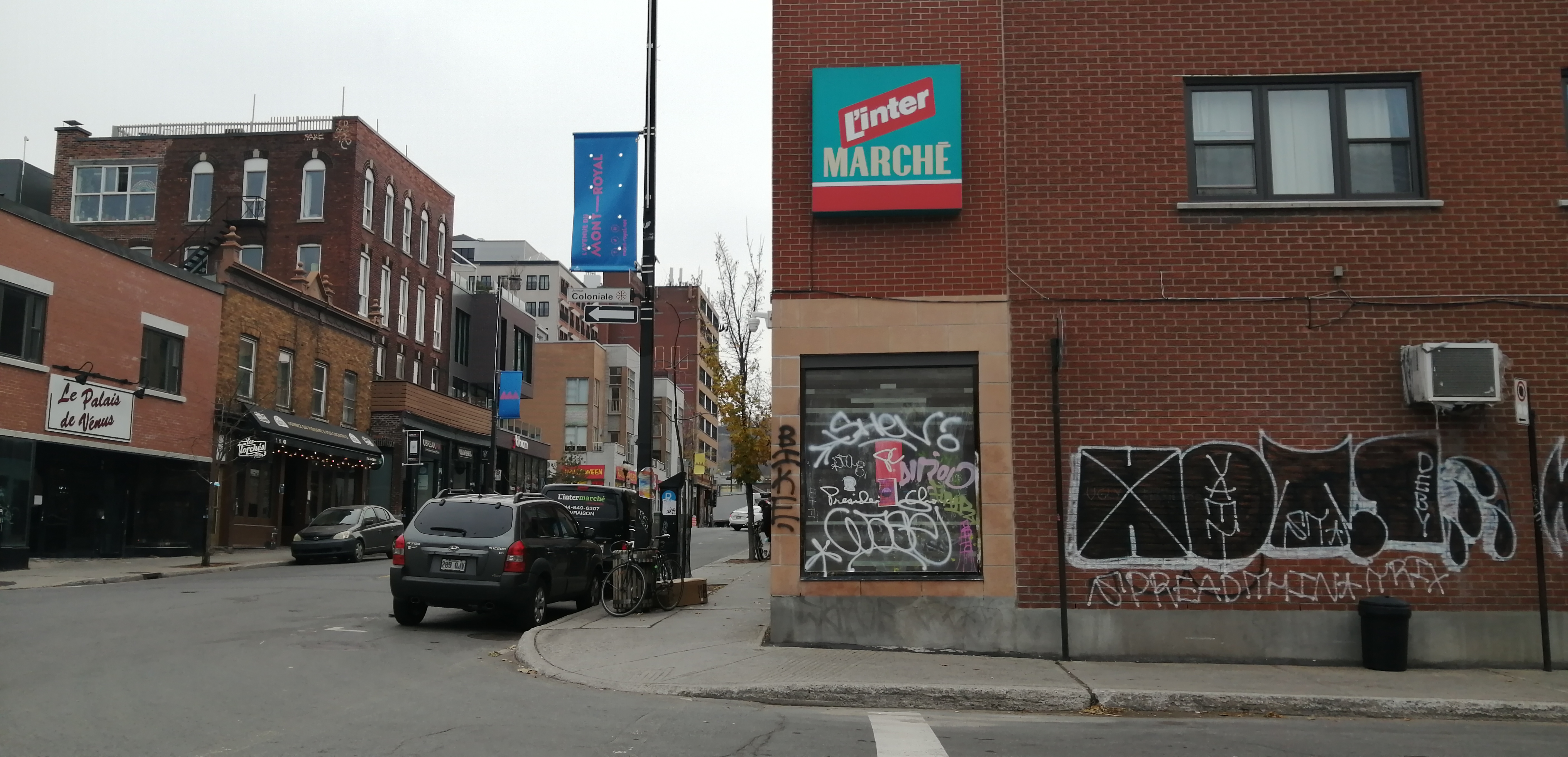 Aucune surface n’est épargnée : les logements, le sol, les panneaux de signalisation. Et même les institutions, comme l’École nationale de théâtre du Canada ou encore la bâtisse des Sœurs franciscaines missionnaires de Marie.