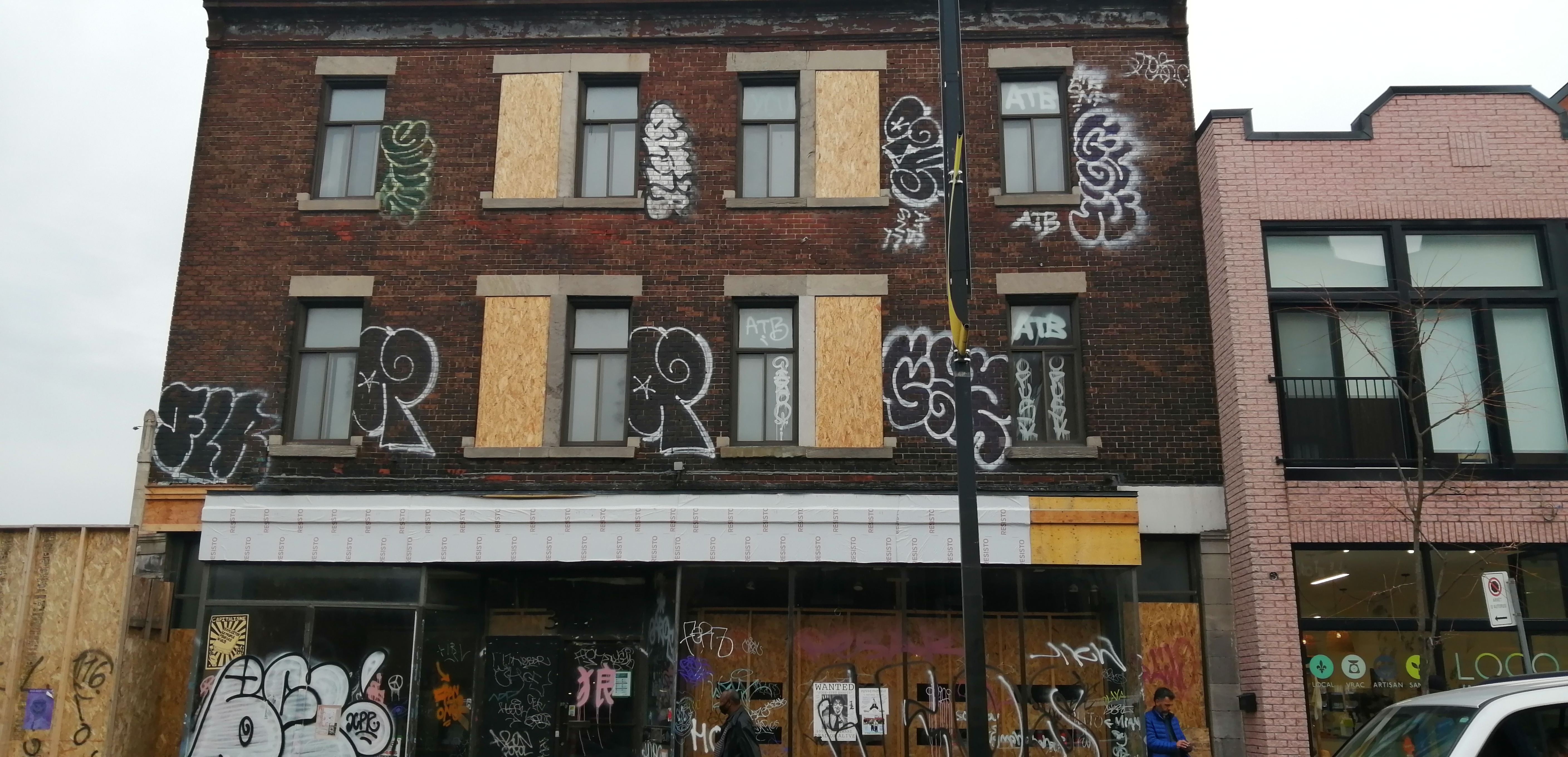 Aucune surface n’est épargnée : les logements, le sol, les panneaux de signalisation. Et même les institutions, comme l’École nationale de théâtre du Canada ou encore la bâtisse des Sœurs franciscaines missionnaires de Marie.