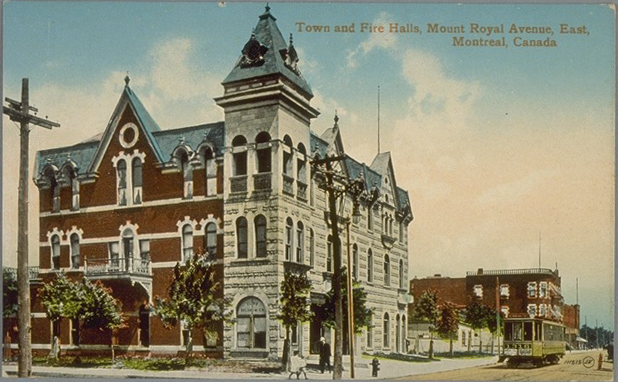 La Caisse d’économie des pompiers de Montréal y est aussi fondée. L’Hôtel-de-Ville possédait à l’origine une imposante tour d’angle qui était l’élément principal de sa composition architecturale. Elle dut malheureusement être démolie en 1931, à cause de faiblesses structurales importantes. La photo illustre un attelage assurant le transport des boyaux et équipements. L’écurie sera mise au repos en 1935, après 85 ans de loyaux services.