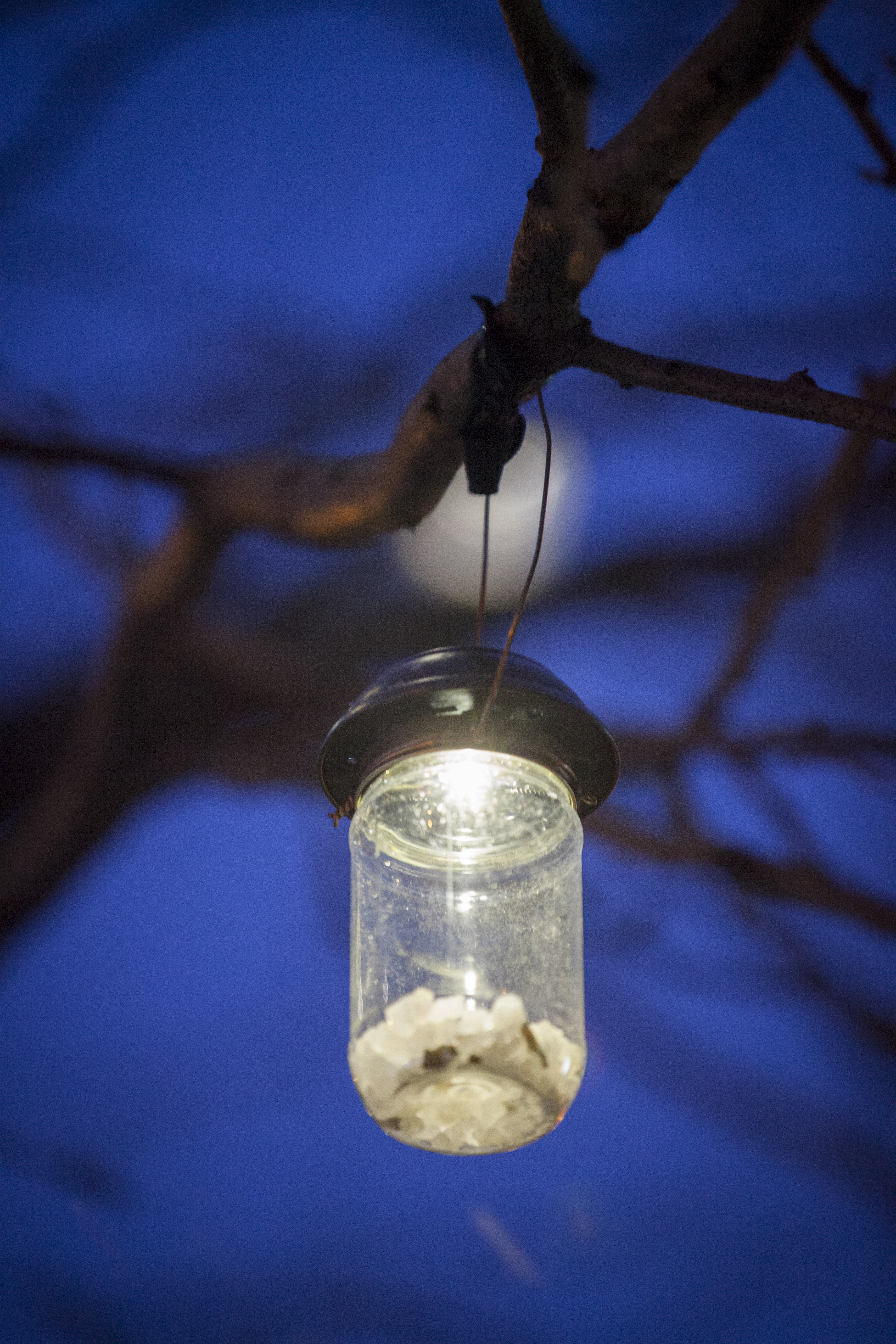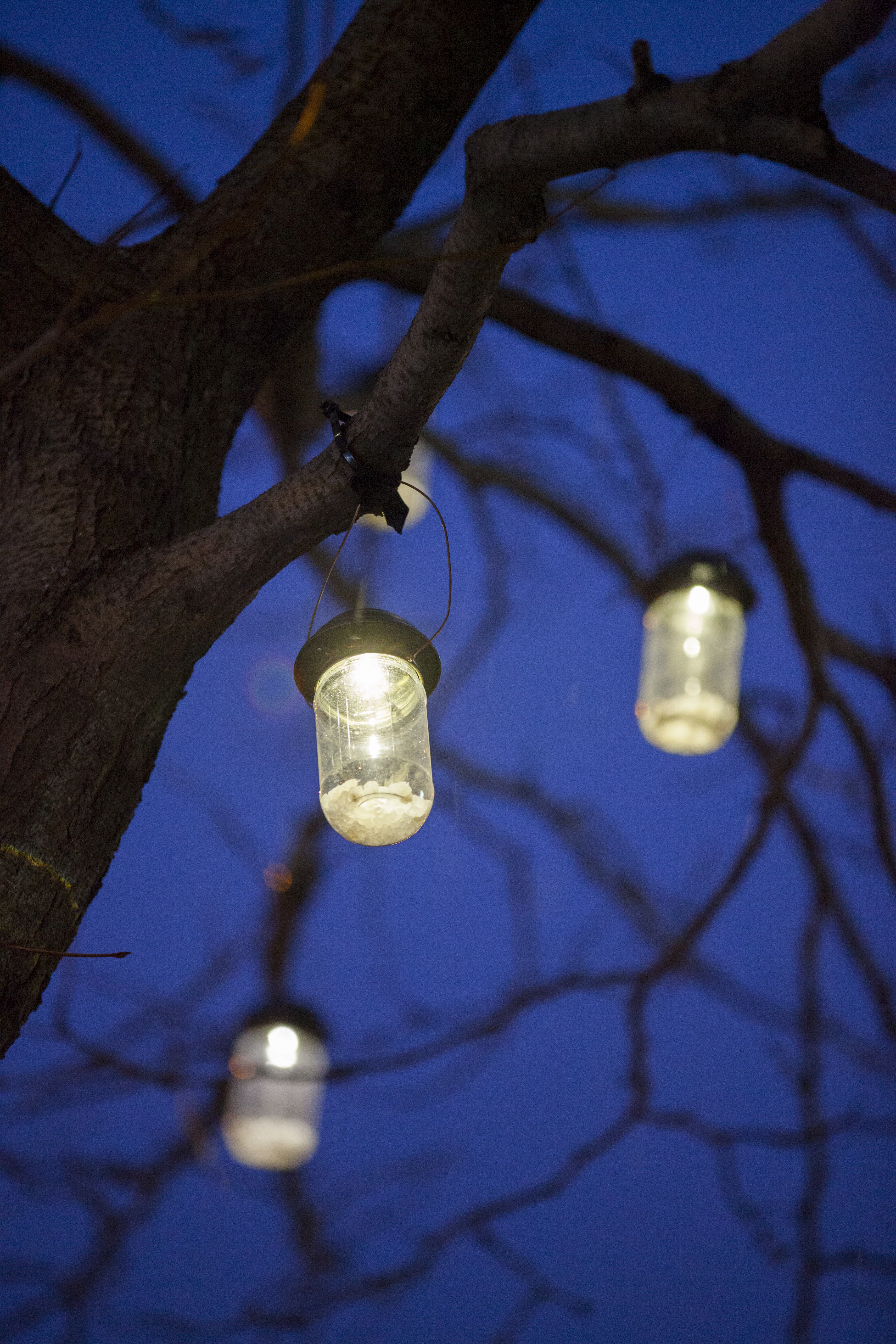 Les lumières sont en fait constituées d’un type de plastique imitant le verre et les fameux contenants. Pour des raisons de sécurité, il n’était pas possible d’utiliser de véritables pots Mason, qui auraient pu blesser des passants en tombant ou briser des branches. Le couvercle possède une pile de recharge solaire conçue sur mesure, pour les besoins de la cause. Plus l’exposition est longue, plus les luminaires éclairent longtemps. Actuellement, ils s’illuminent jusqu’à 22h30, mais lorsque la saison estivale débutera, les lumières s’éteindront vers les petites heures du matin.