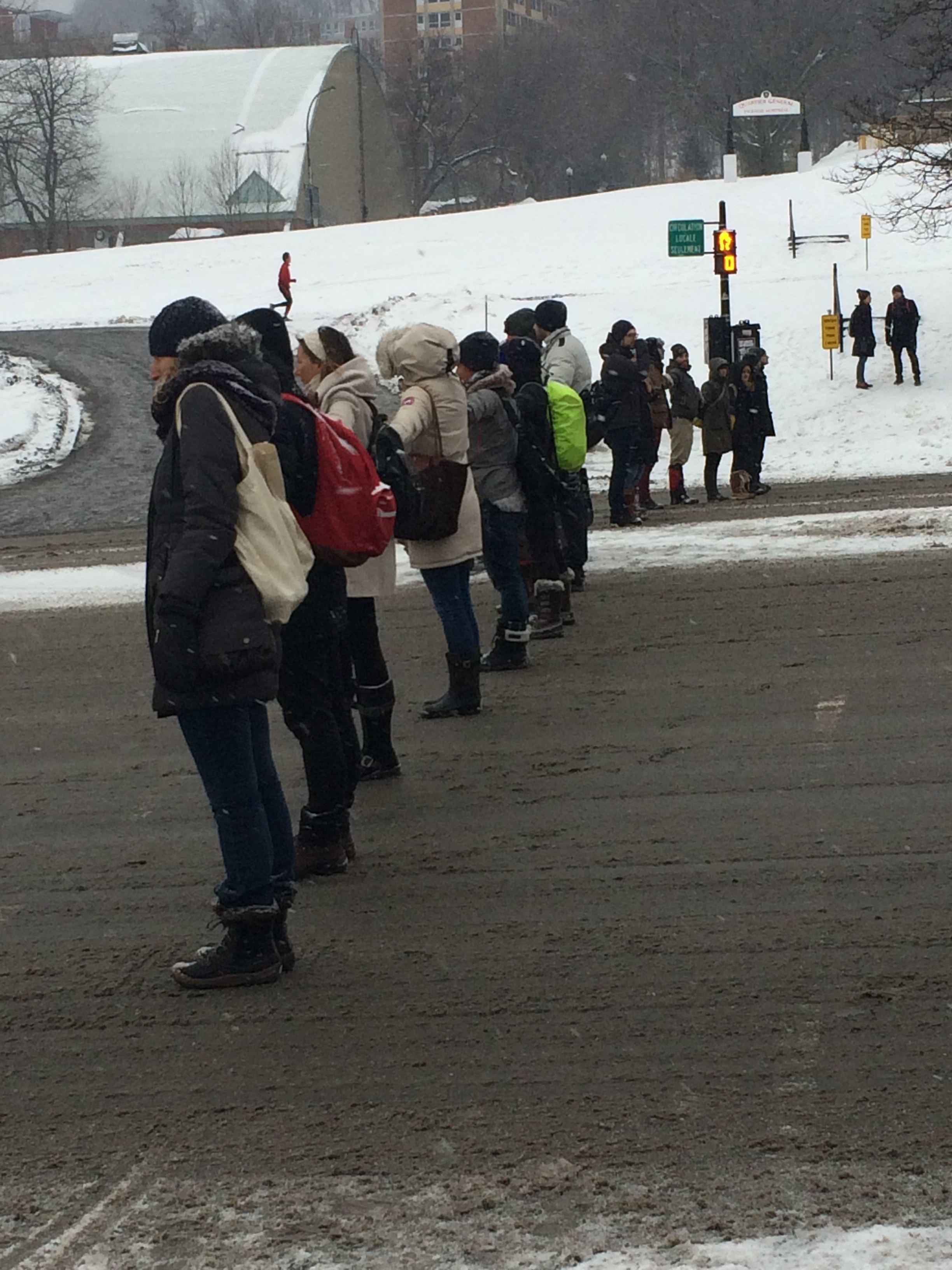 Lorsque le feu a tourné au vert, les automobilistes ont démontré des signes d’impatience. Ils blasphémaient, klaxonnaient et véhémaient contre les piétons. Un véhicule utilitaire sport a passé entre la chaîne humaine et même par-dessus le terre-plein pour continuer sa route.
