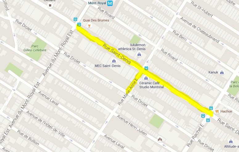 • La rue Saint-Denis, des deux côtés de la rue, entre l’avenue du Mont-Royal et la rue Rachel.