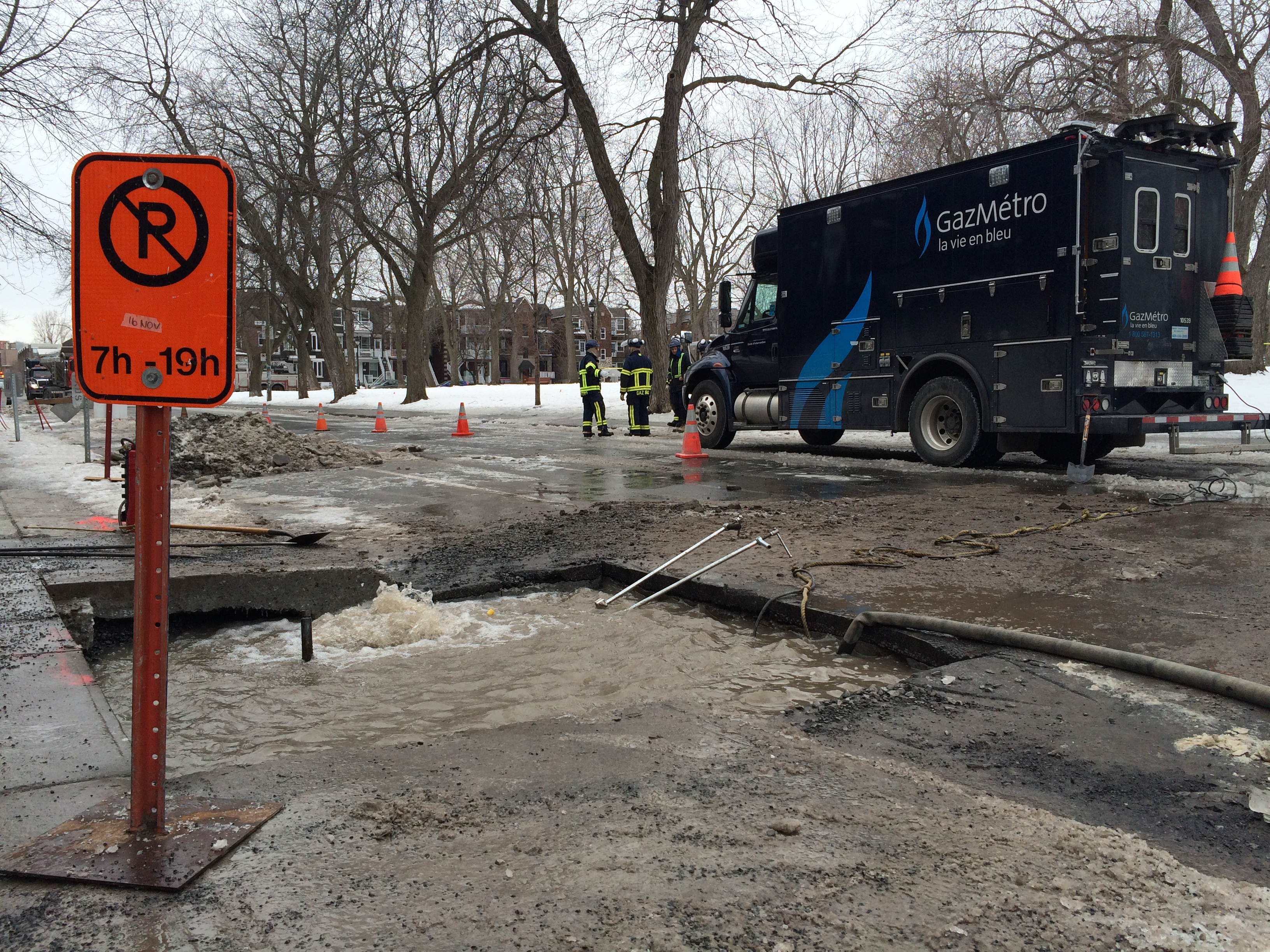 Gaz Métro, Hydro-Québec et des policiers ont aussi été dépêchés sur les lieux. L’avenue Laurier a été fermée jusqu’à ce que la brèche sur la petite conduite résidentielle soit colmatée, vers 12h15.