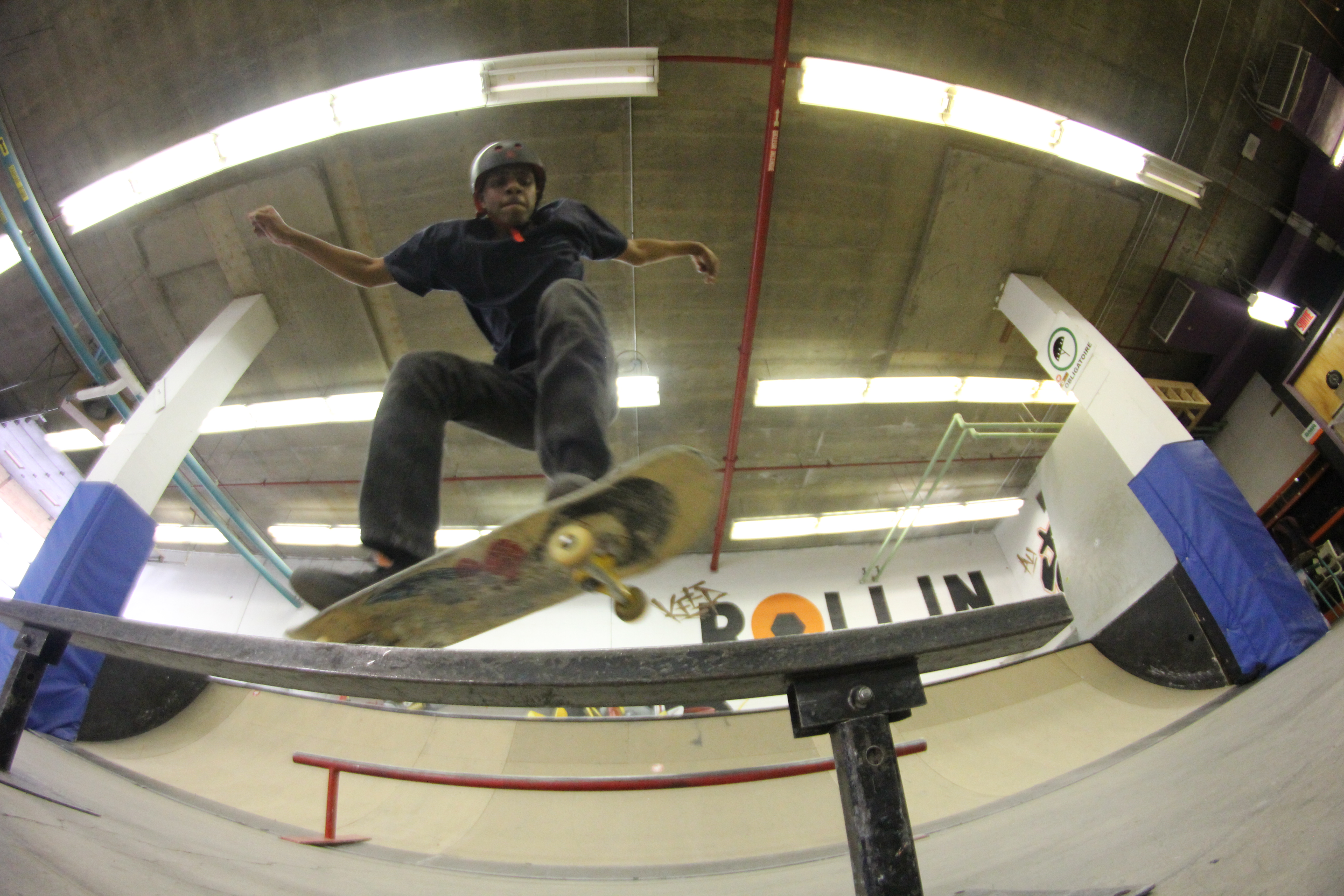 Le JM Court, un skatepark intérieur, situé dans un garage de l’école secondaire Jeanne-Mance, aide les jeunes à cultiver leur passion pour la planche à roulettes, tout en les motivant à l’école.