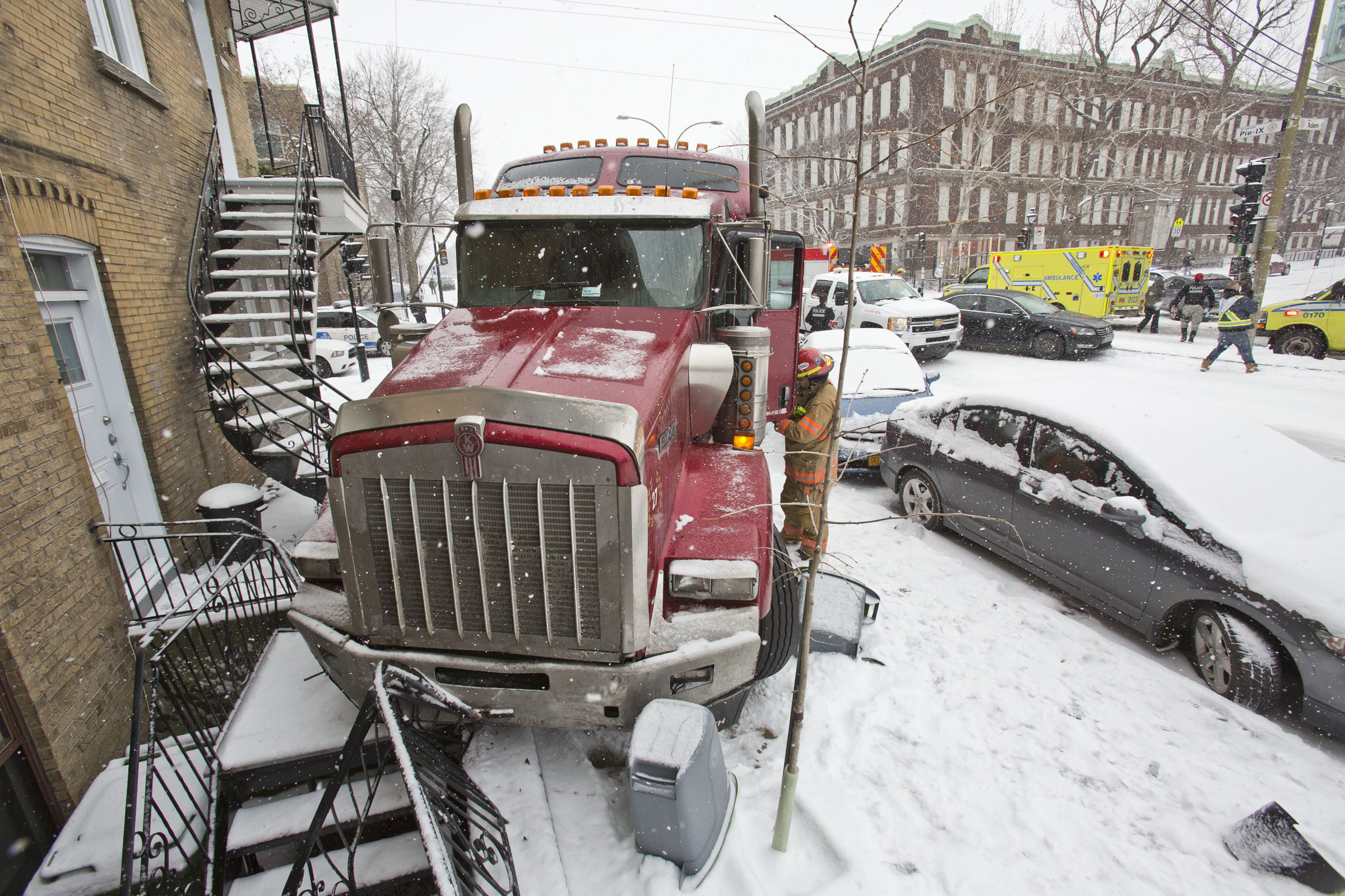 Un poids lourd a percuté la façade d’un immeuble à logements, ce matin, sur le boulevard Pie-IX, près de la rue Sainte-Catherine.